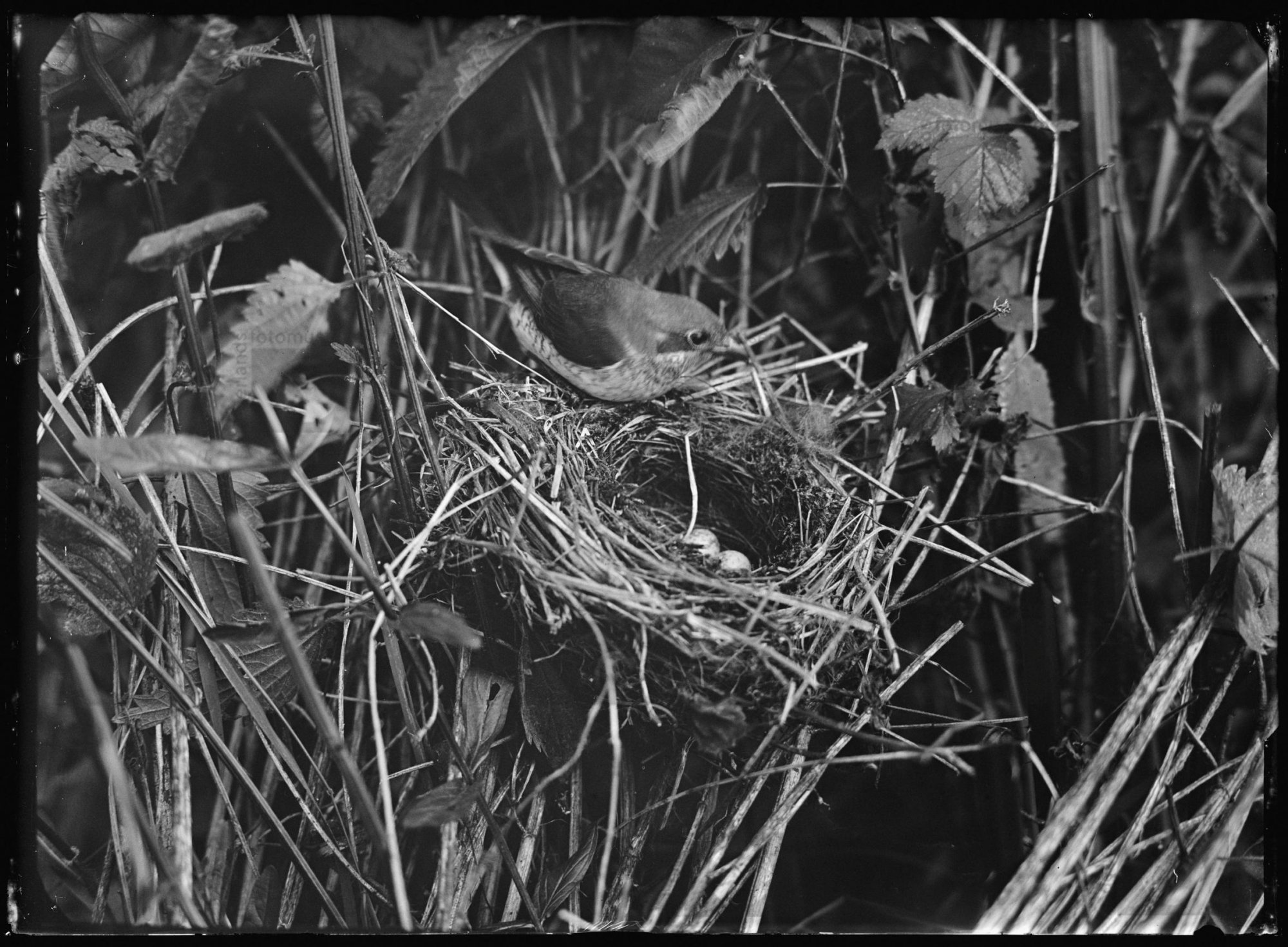 Tuinfluiter bij nest met jongen, Nunhem (1914)