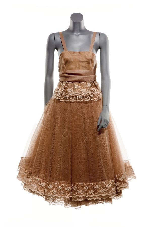 Avondjurk van bruine kunstzijde, organza en nylon tu...