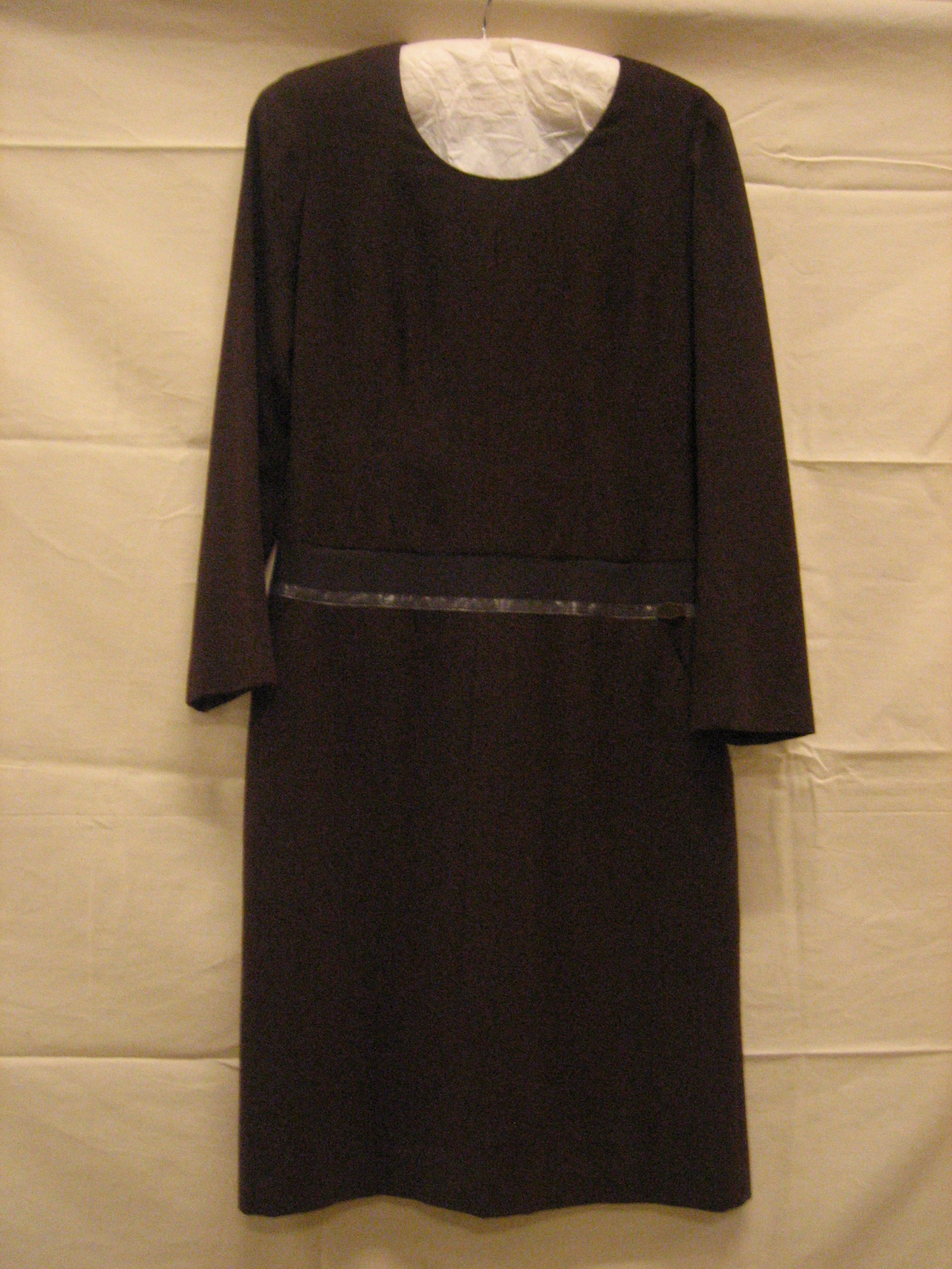 Jurk van bruine keperwol, gemeleerd met rood en groen
