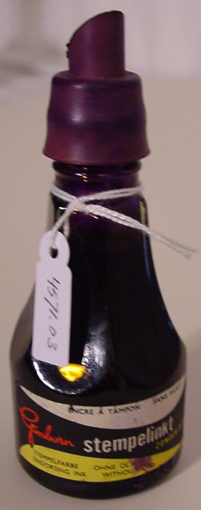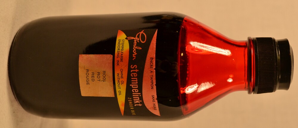 Inktfles van glas gevuld met stempelinkt door H. van...