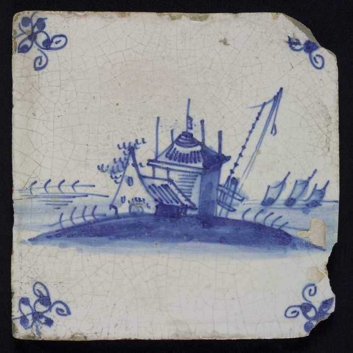 Tafereeltegel, blauw, vuurbaak en baakwoning, hoekmo...