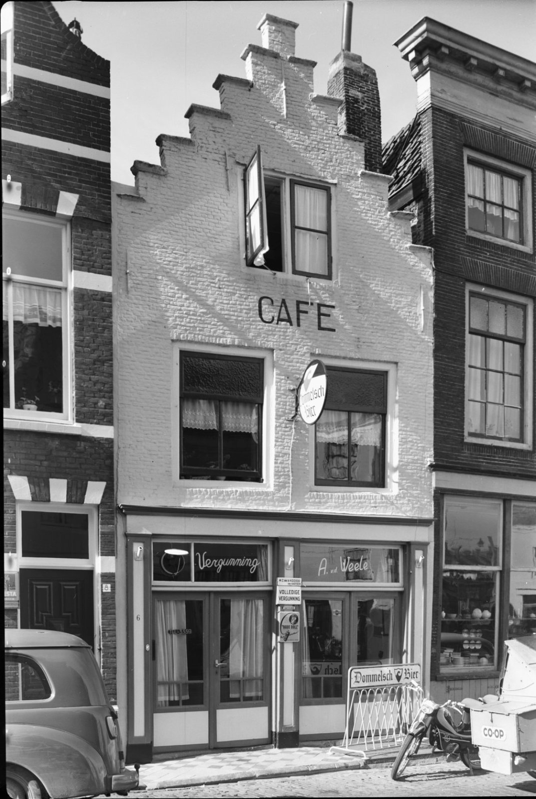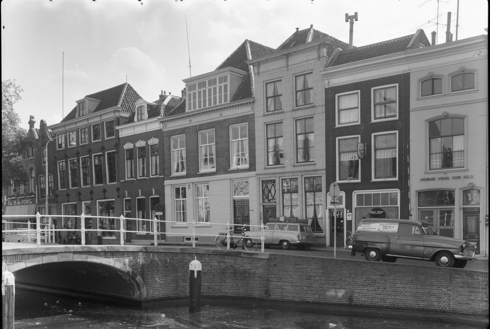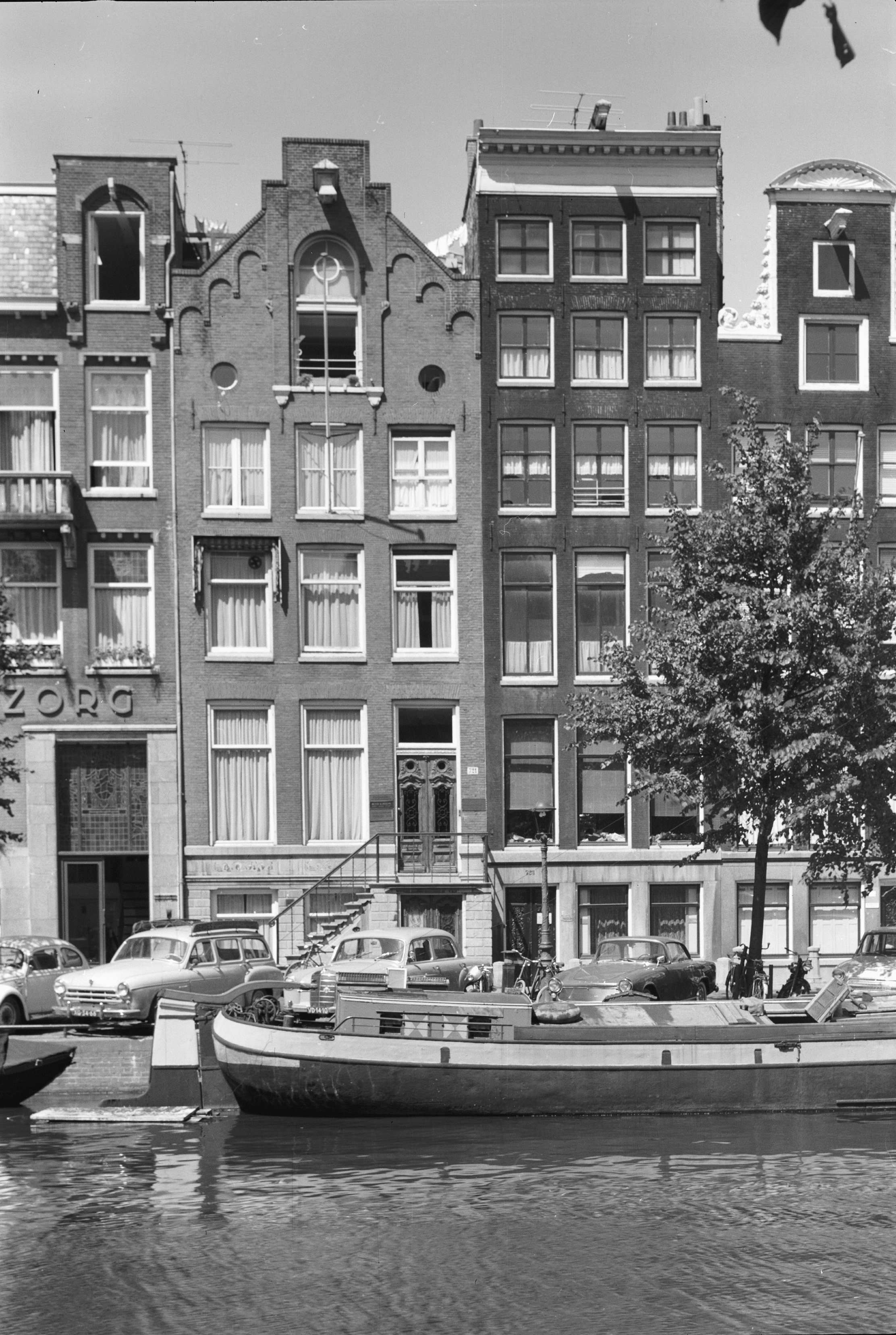 Voorgevels van rij grachtenpanden, met geparkeerde a...