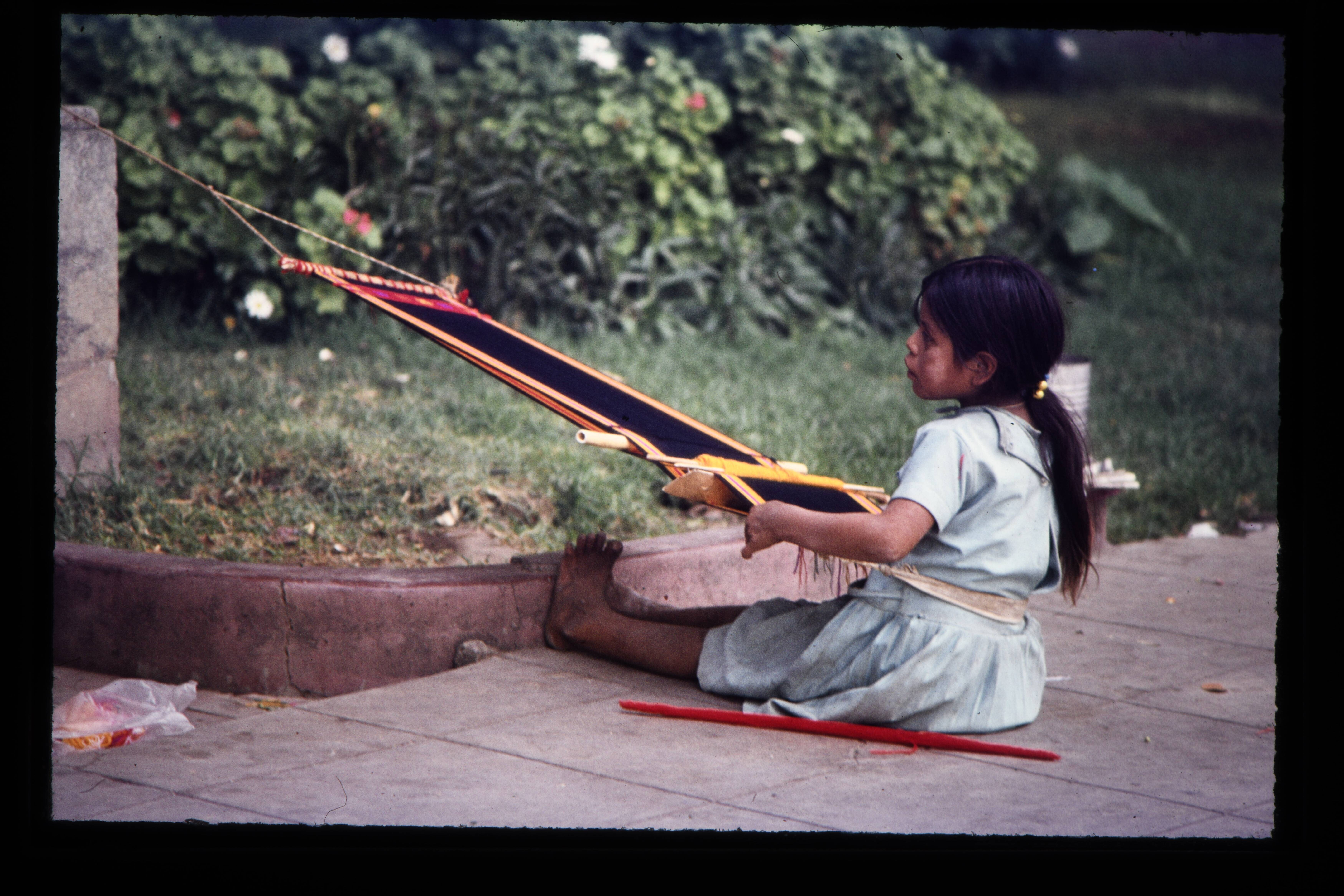 'Vrouwen aan het weven met het heupweefgetouw.'