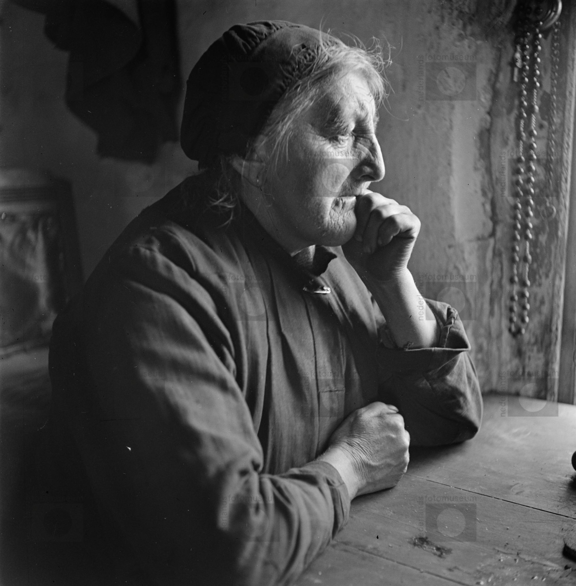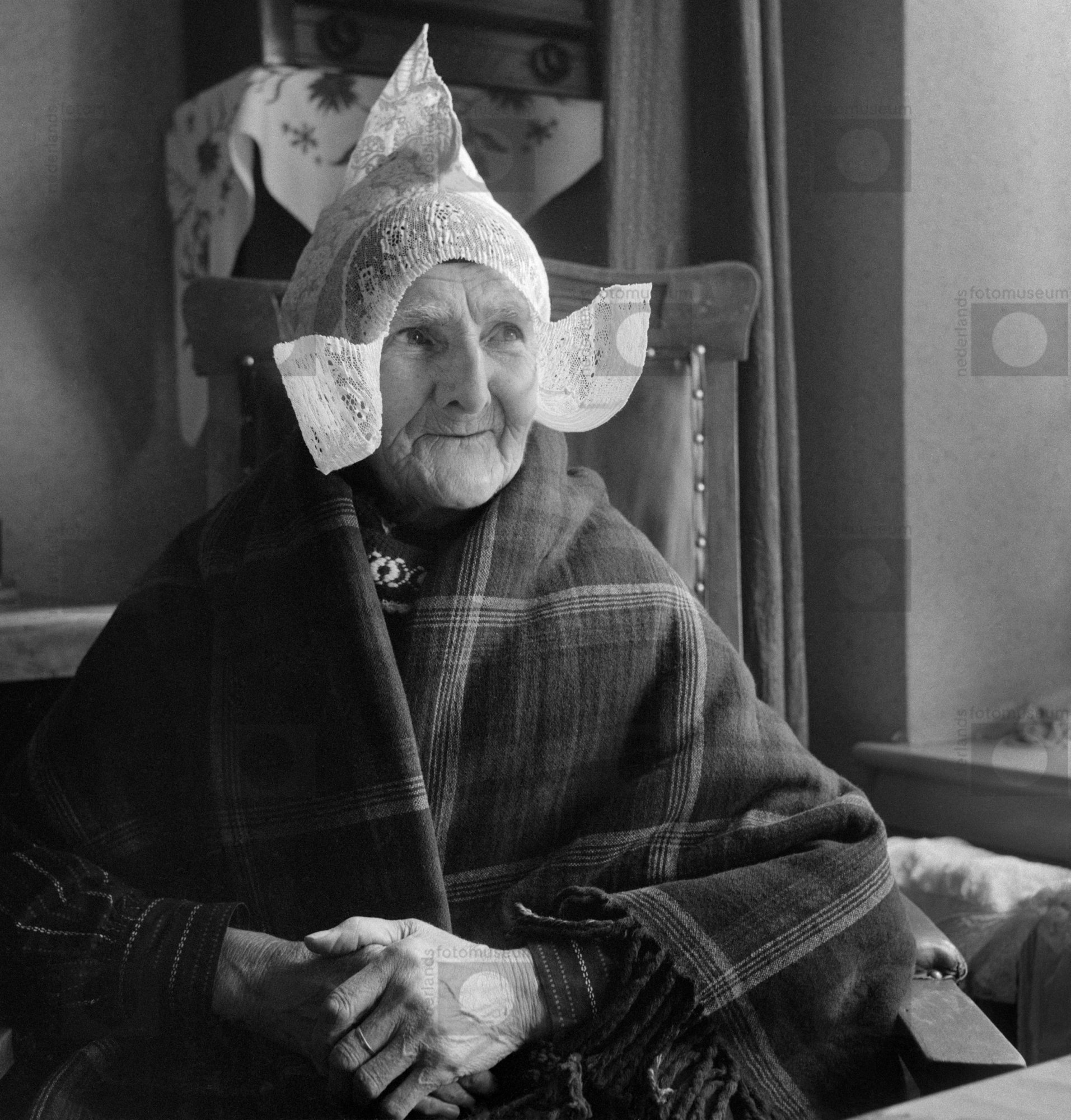 Oude vrouw in klederdracht met ouderwetse hul, Volen...