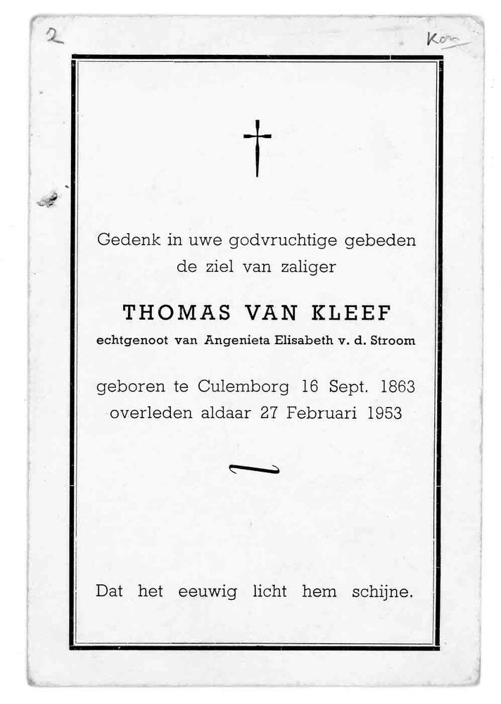 bidprent voor Thomas van Kleef. Geboren 16-09-1863 t...