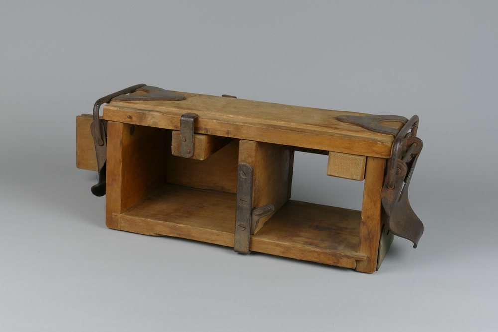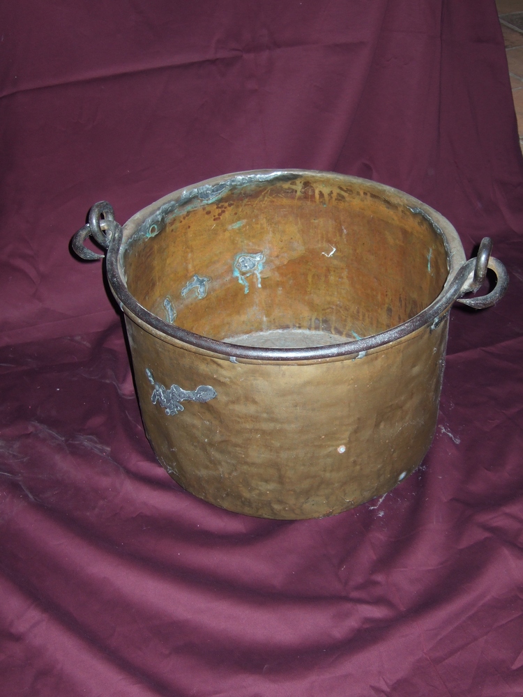 houtbak van geel koper, met ijzeren hengsel.