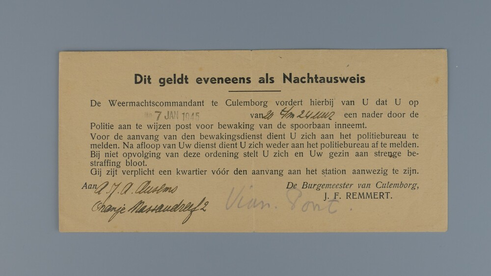 ontheffing op papier, voor avondklok, op naam van A....