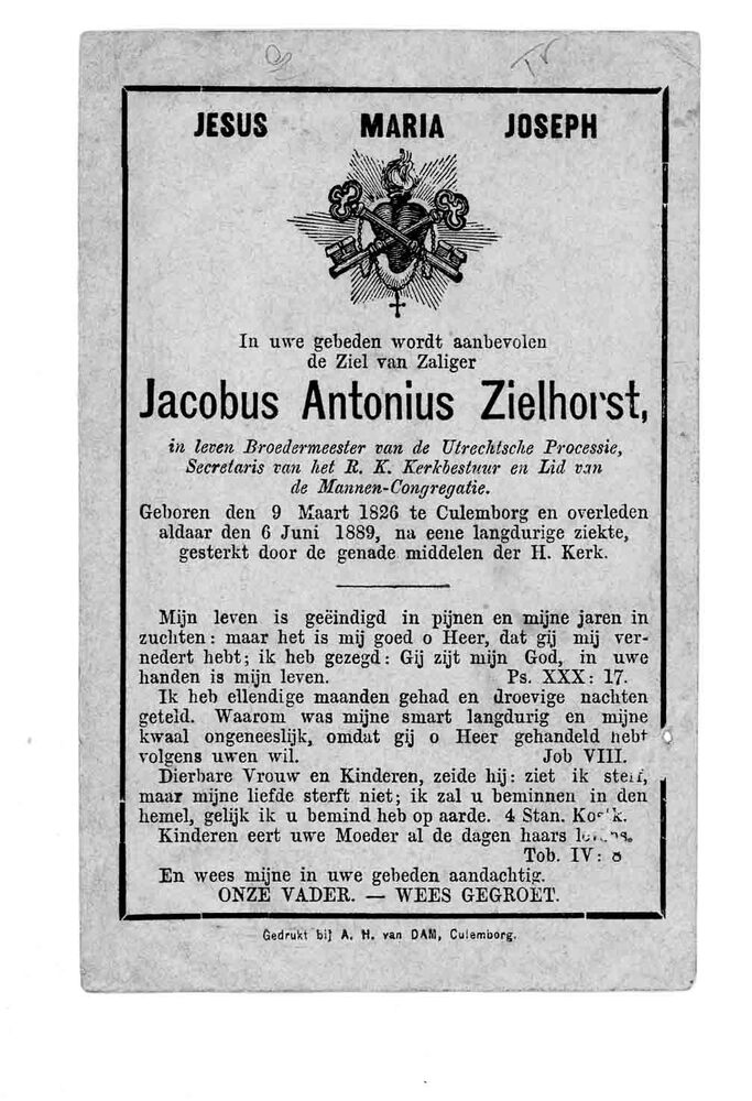 bidprent voor Jacobus Antonius Zielhorst. Geboren 09...