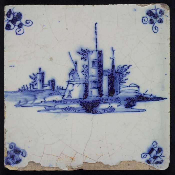 Tafereeltegel, blauw, kasteel met gebouwen, hoekmoti...