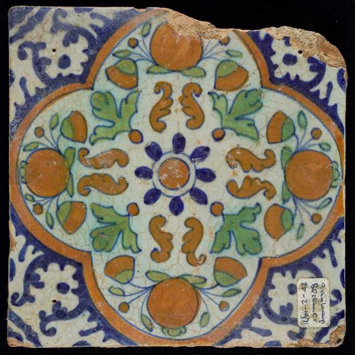 Ornamenttegel, rozet waarboven oranjeappels en gouds...