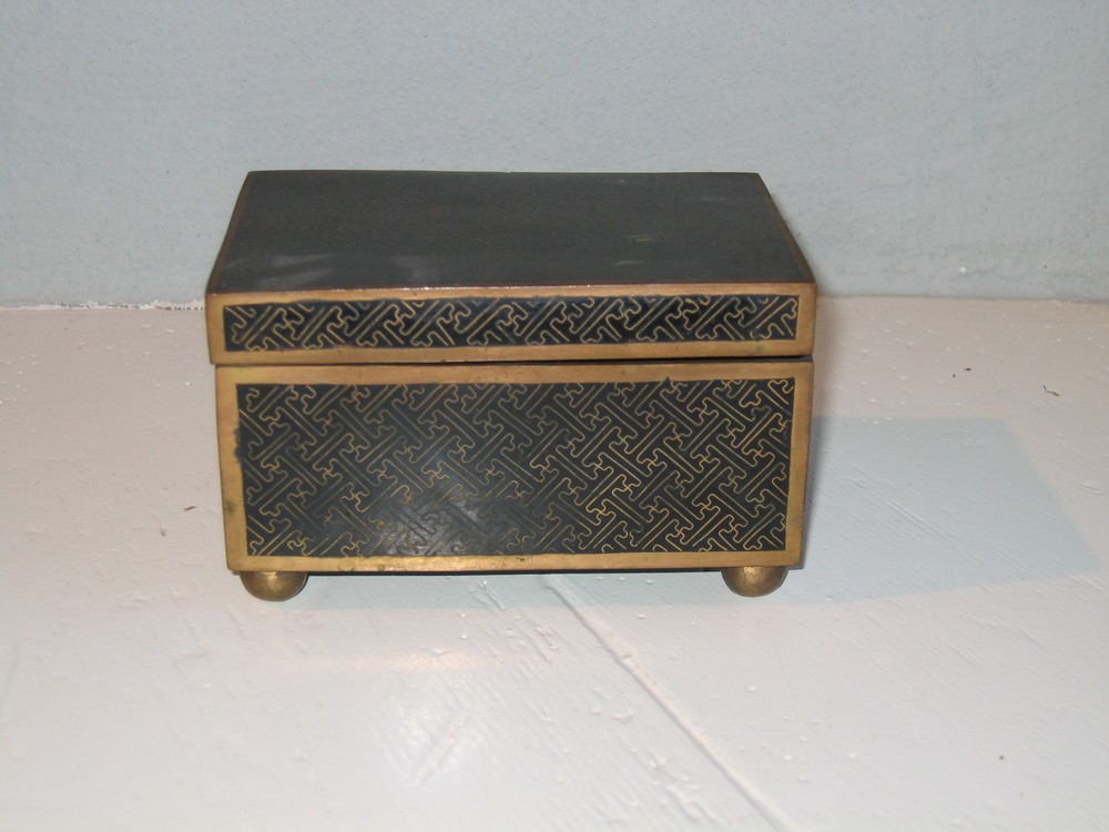Zwart versierd koperen kistje, binnen turquoise besc...