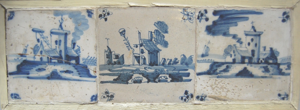 tegelveld. Drie tegels op blauw wit fond met decorat...