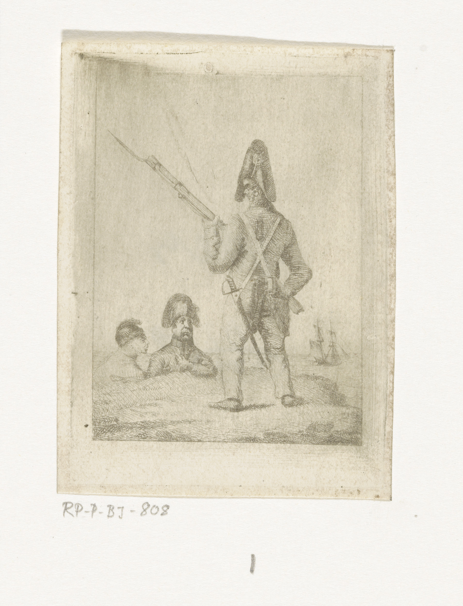 Studieblad met een soldaat aan het strand