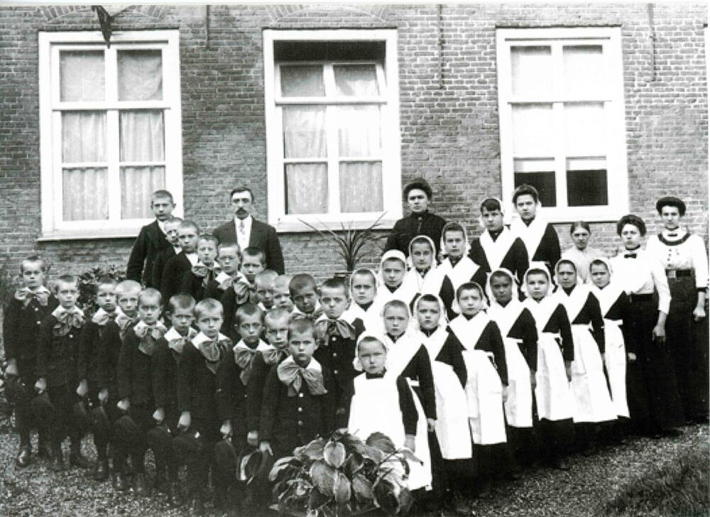 Ansichtkaart, voorstellende een groep weeskinderen v...