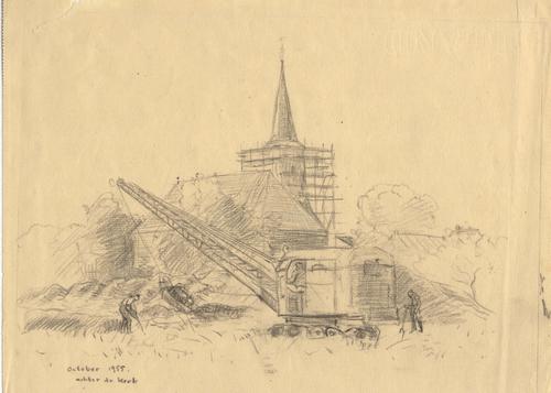 Tekening met als titel " Achter de kerk"