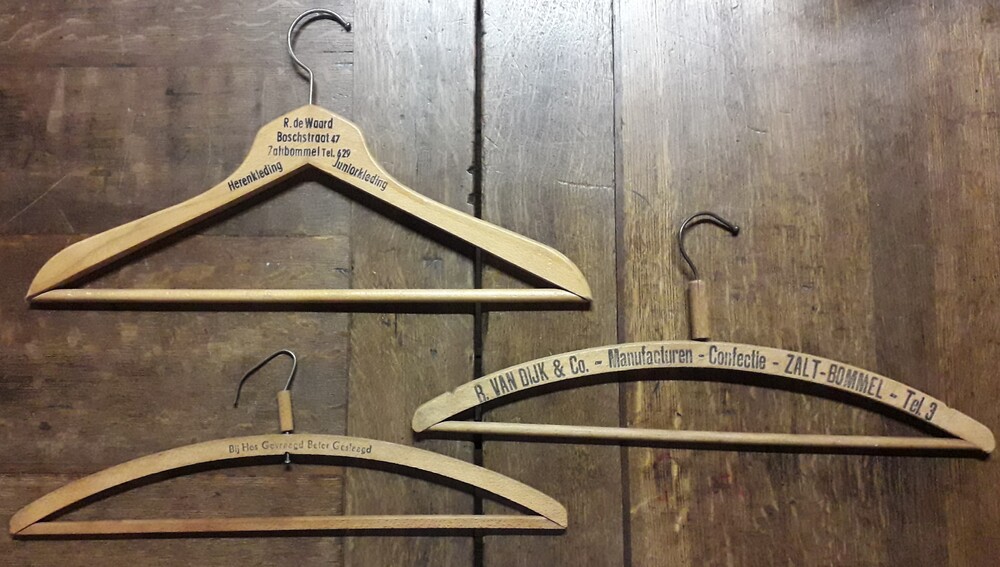 Drie kledinghangers uit oude Bommelse kledingwinkels