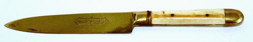 Mes. Bronzen fruitmesje met ingelegd benen heft.