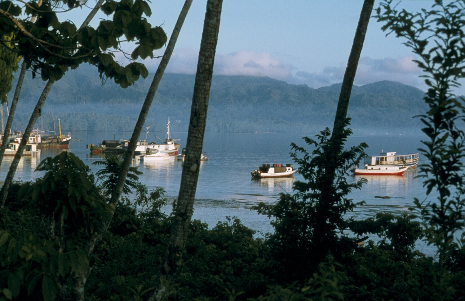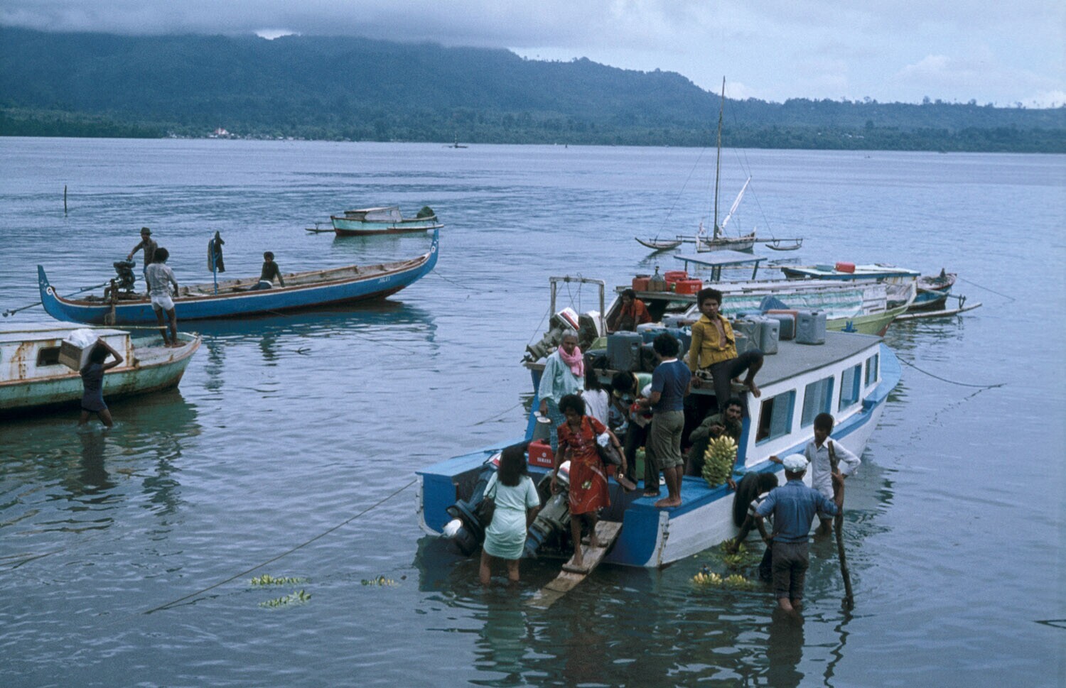 Zeilprauwen voor de kust van Tulehu op Ambon, Molukken.