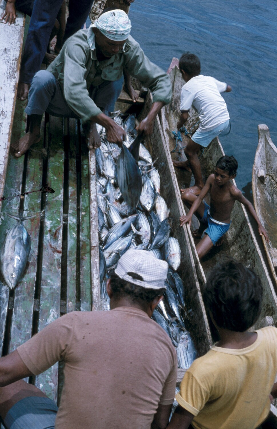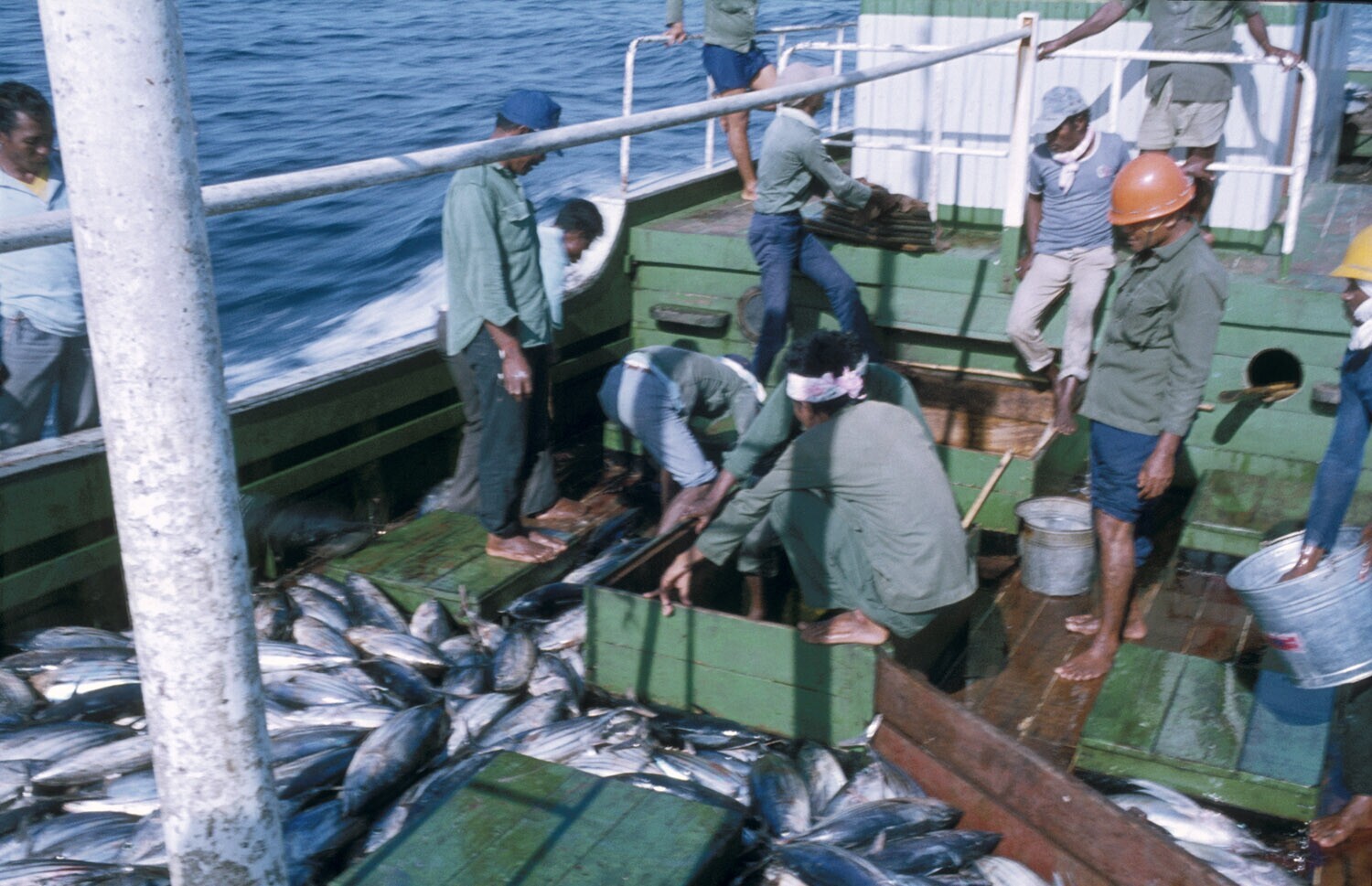 'De vissers van een tonijnvisser in actie; de tonijn...