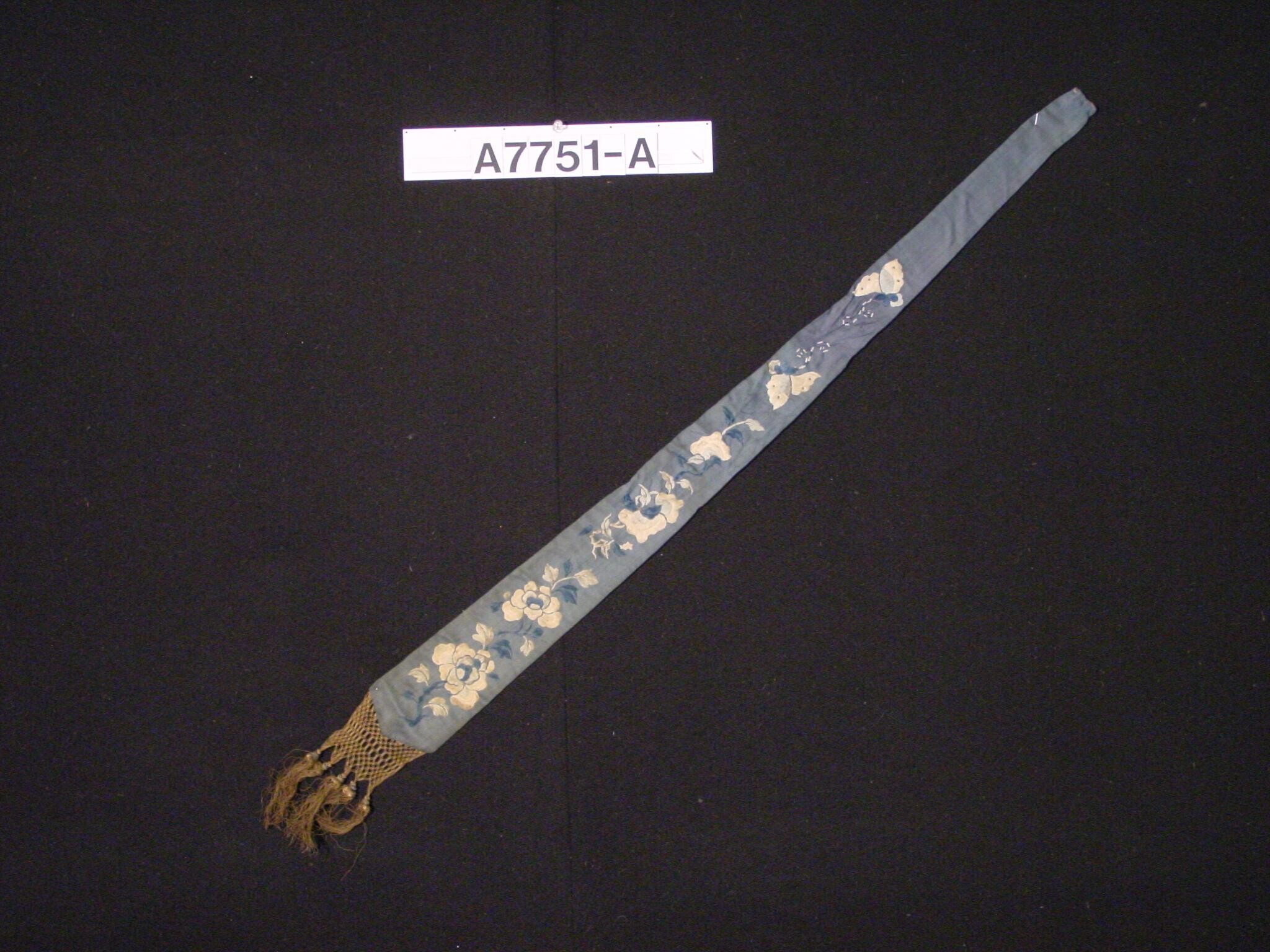 Band van blauwe zijde met geborduurd bloemenpatroon