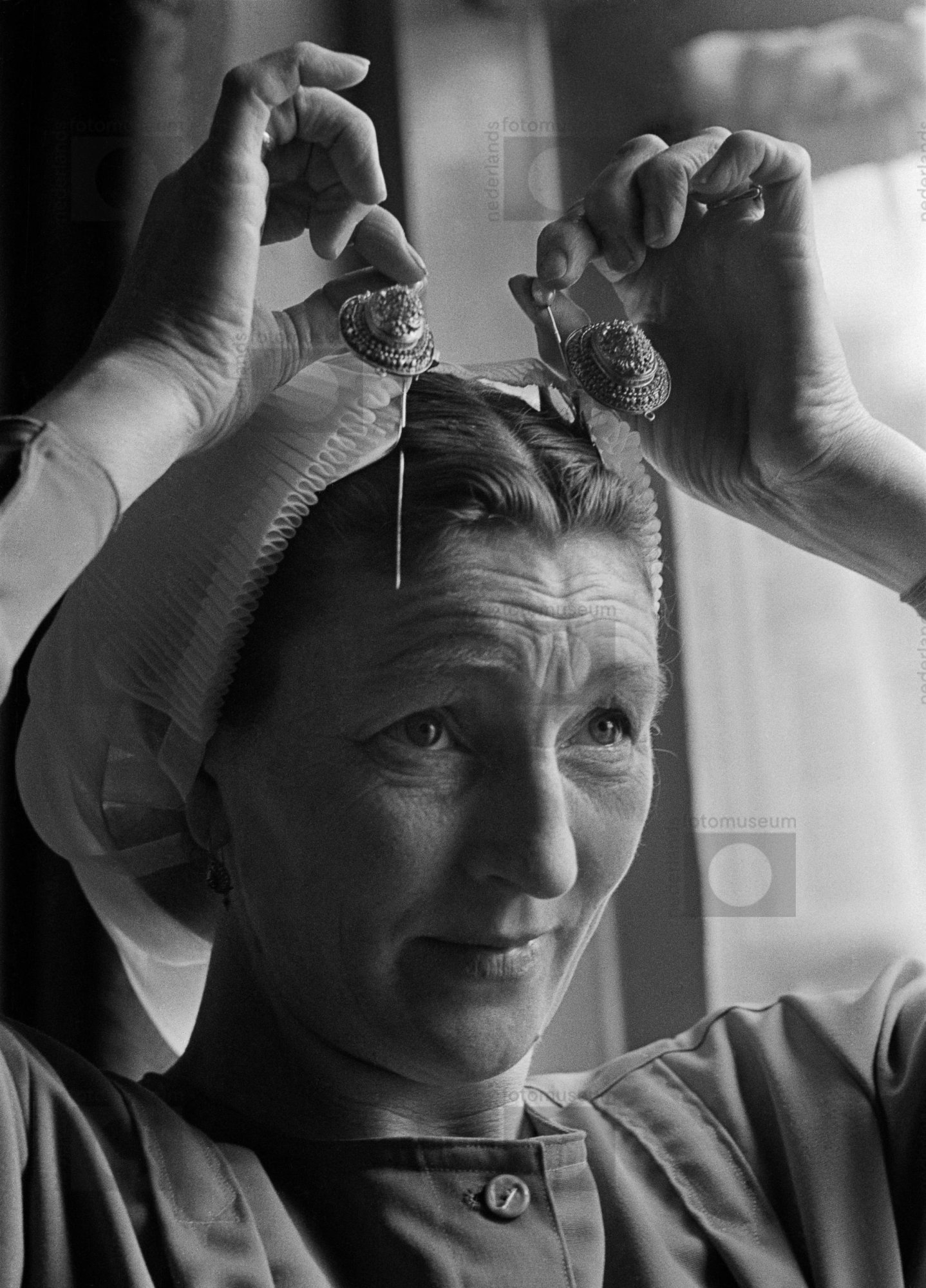 Vrouw in klederdracht zet haar kap op, Scheveningen ...
