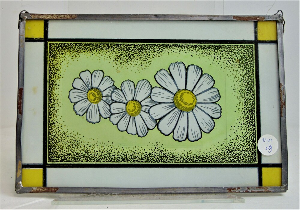 Een decoratief glas/in/loodraam met drie margrieten.