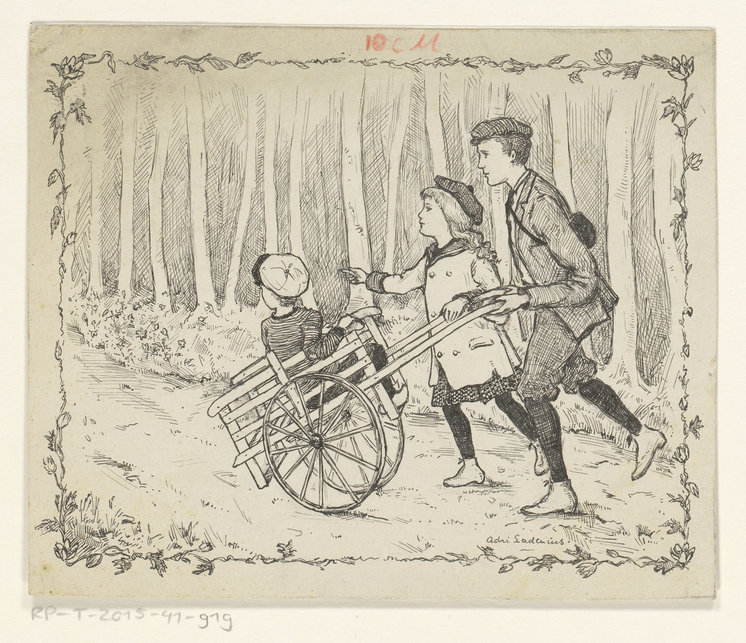 Drie kinderen met een kar op een bospad