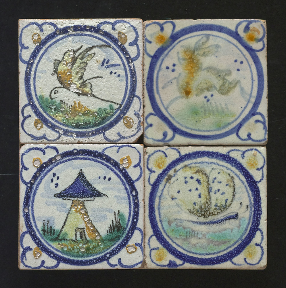 Vier tegels van aardewerk met tinglazuur voorstellen...