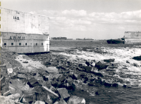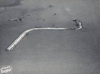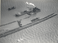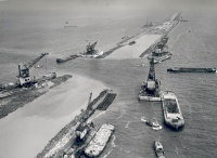 Werkzaamheden aan de haven van Huizen. De havendam i...