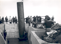 Dijkherstel na de Watersnood van 1953 in Zeeland. Ca...