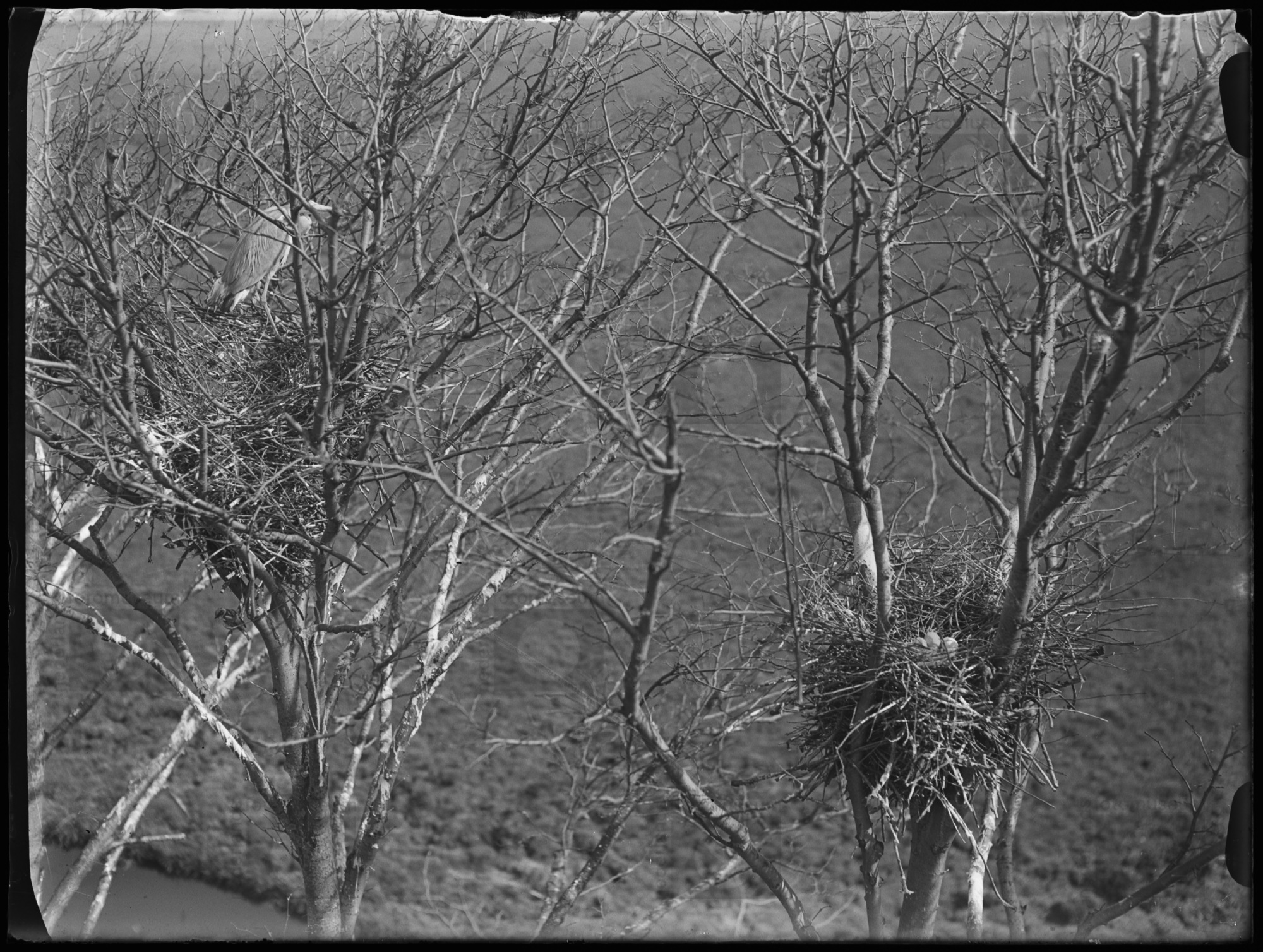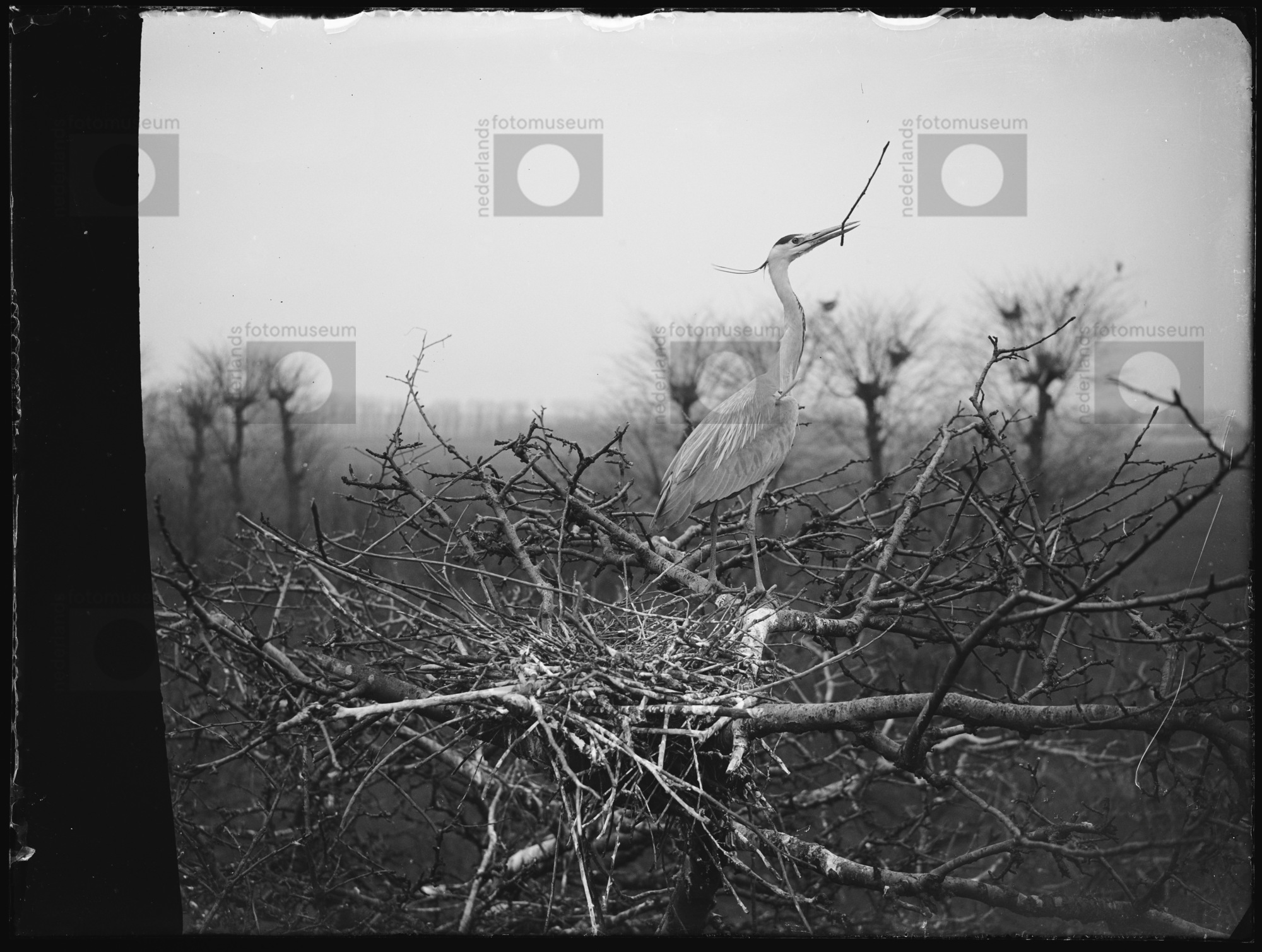 Blauwe reiger staand op nest met eieren, Sloten (193...