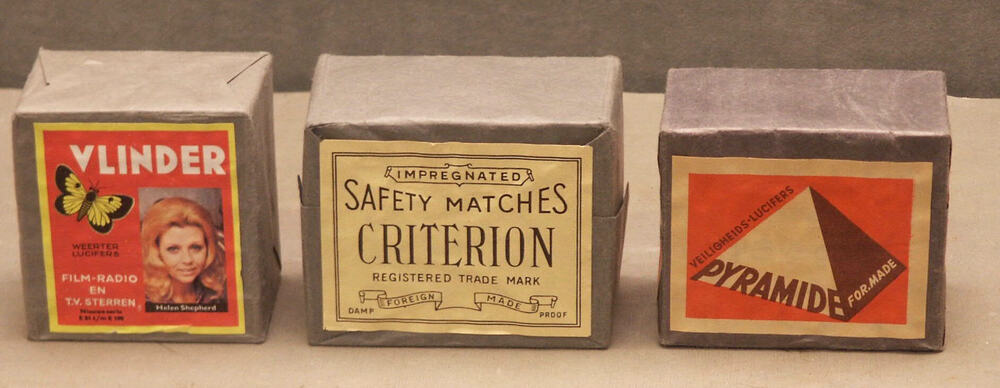 luciferdoosjes met inhoud, in grijs papieren verpakk...