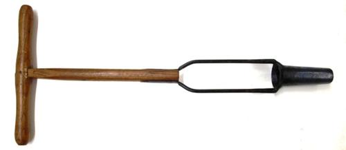Aardappelpootboor van metaal en hout gebruikt om poo...