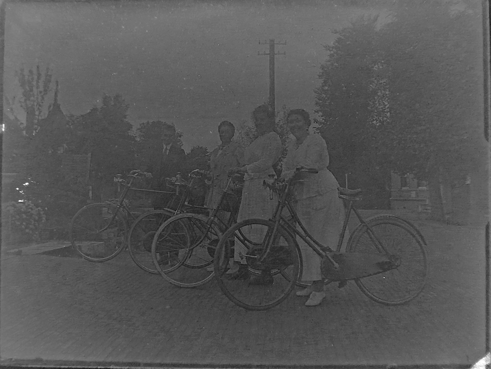 Eén heer en drie dames met fietsen