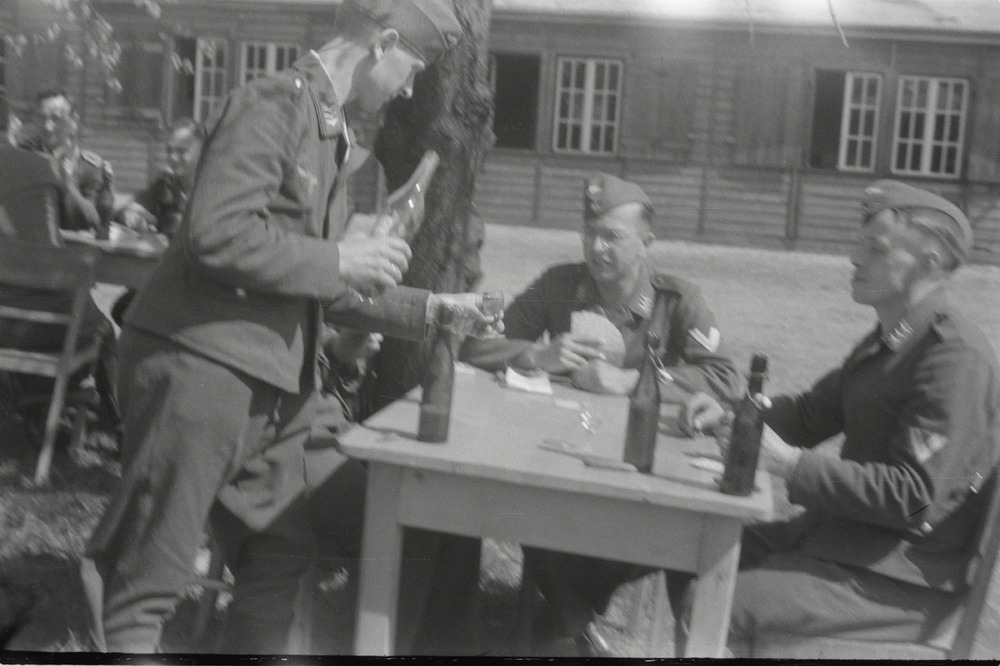 Een aantal Duitse militairen drinkt buiten een biertje.