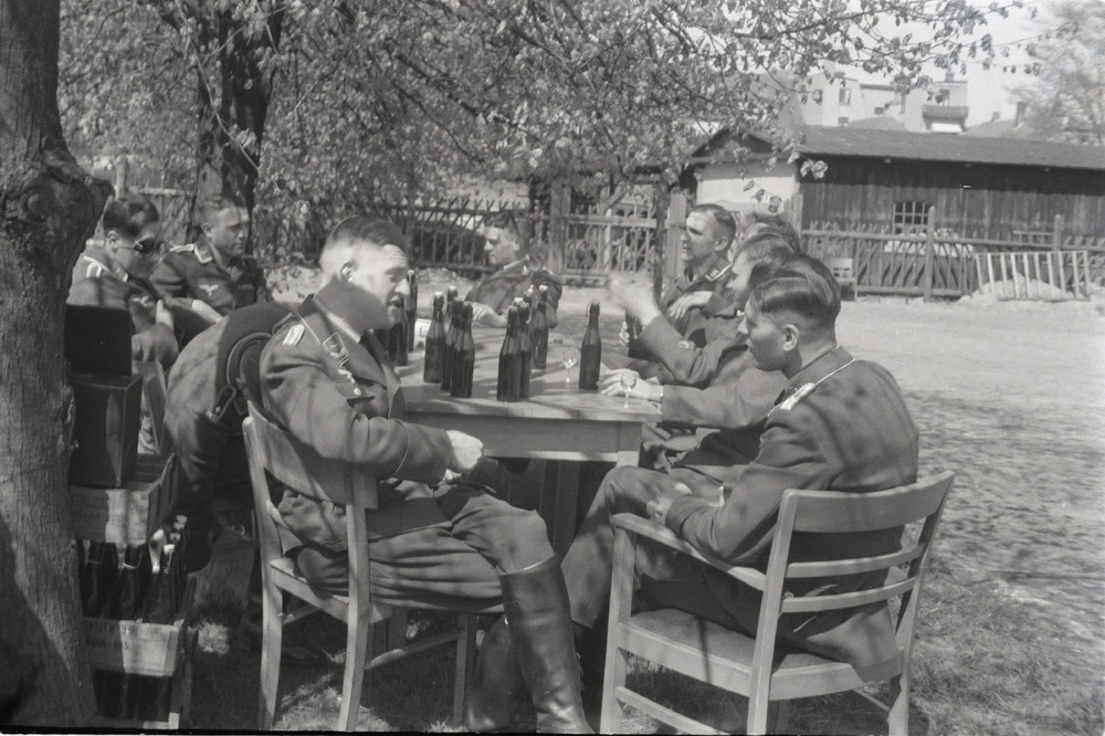 Luftwaffe militairen drinken een biertje na diensttijd.