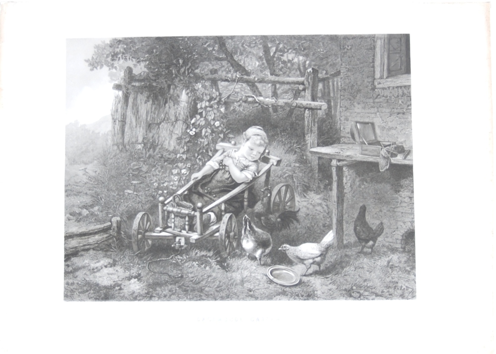 Kunstplaat Ongenoode Gasten. Meisje in bolderkar kij...