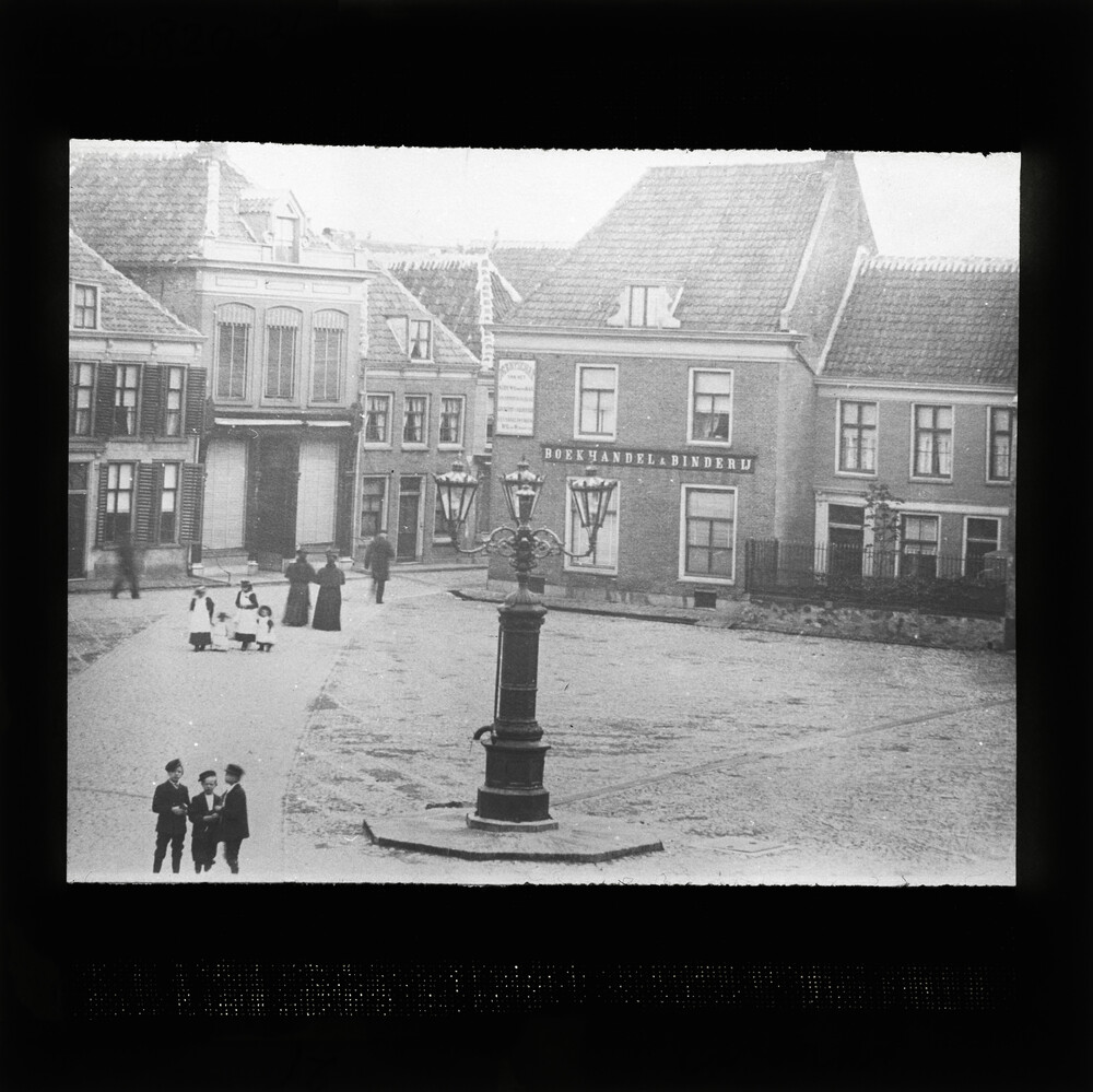 Markt met stadspomp en boekhandel & binderij Wuestman