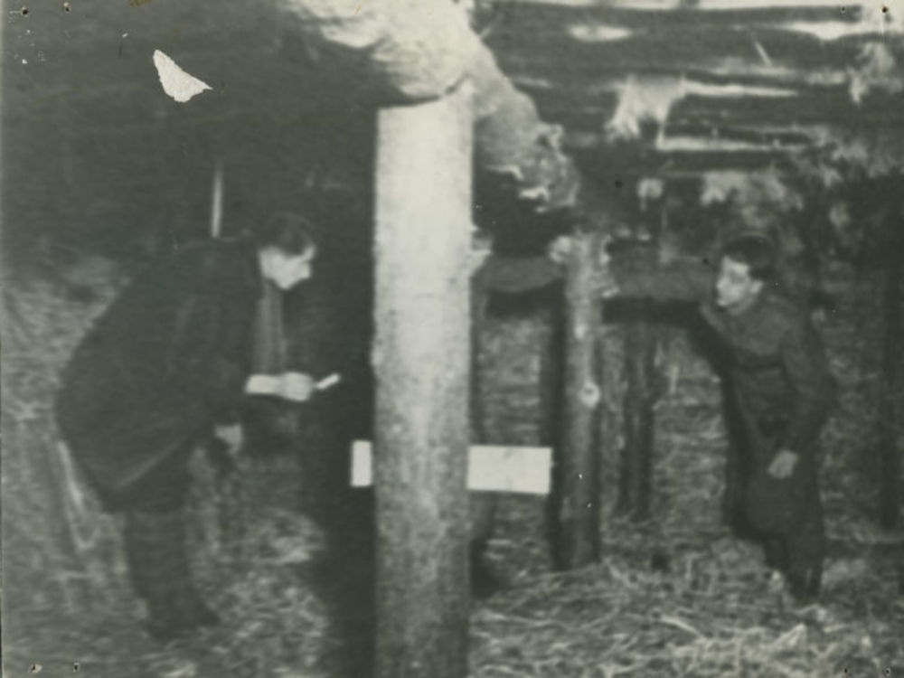 Twee onderduikers in hut in bos. Tekst achterop: "On...