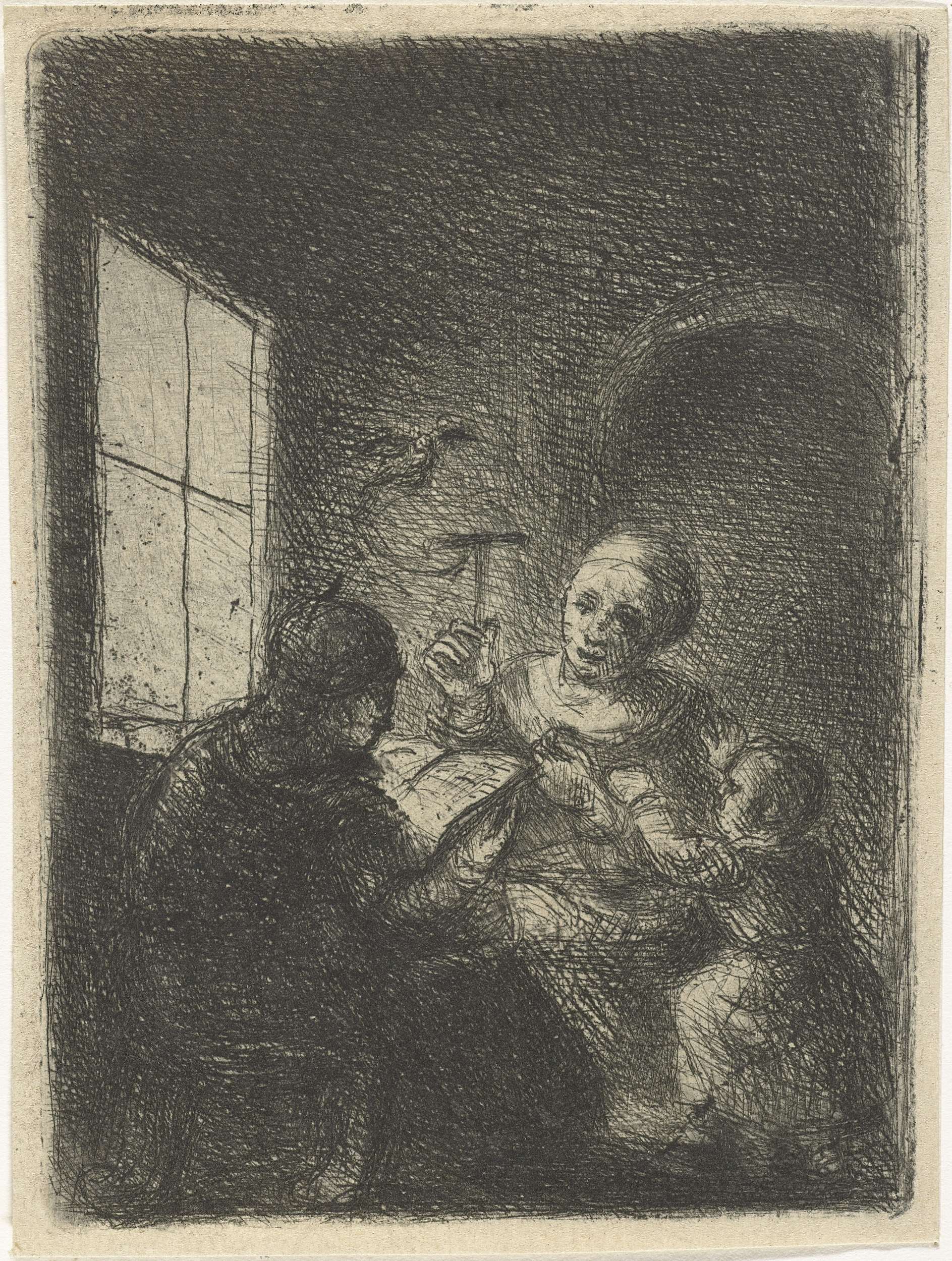 Twee naakte vrouwen bespieden een zoenend paar