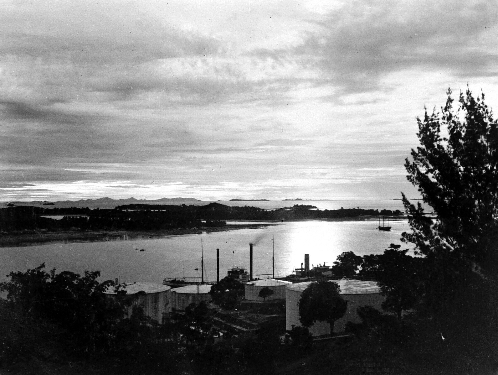 Gezicht over Straat Malakka vanuit de haven met olie...