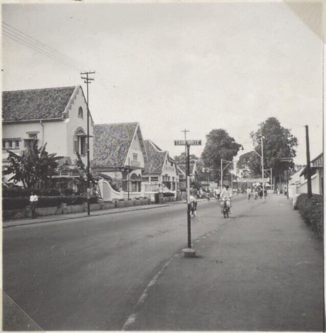 Straatbeeld met wandelaars, op de achtergond Huize D...