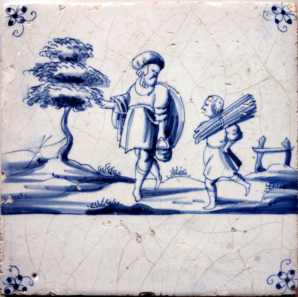 Tegel van keramiek met tinglazuur, voorstellende: De...