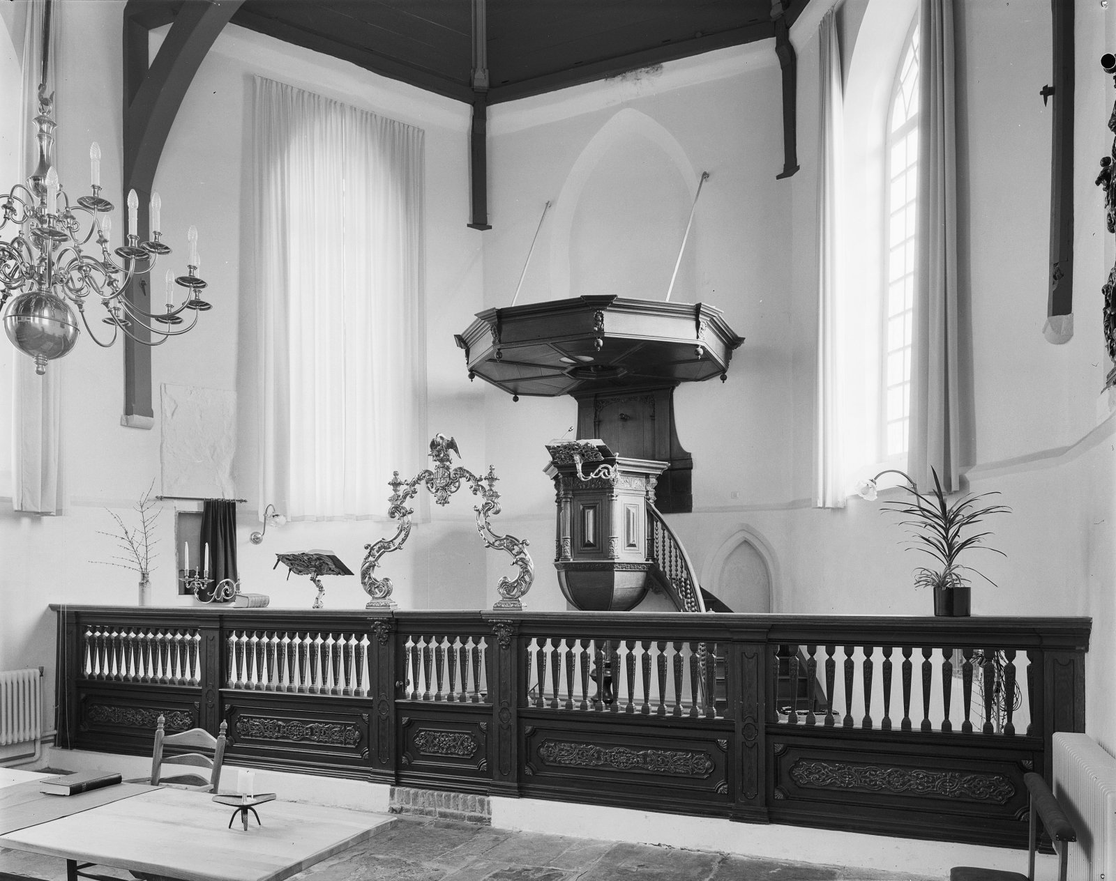 Interieur, koorhek en preekstoel