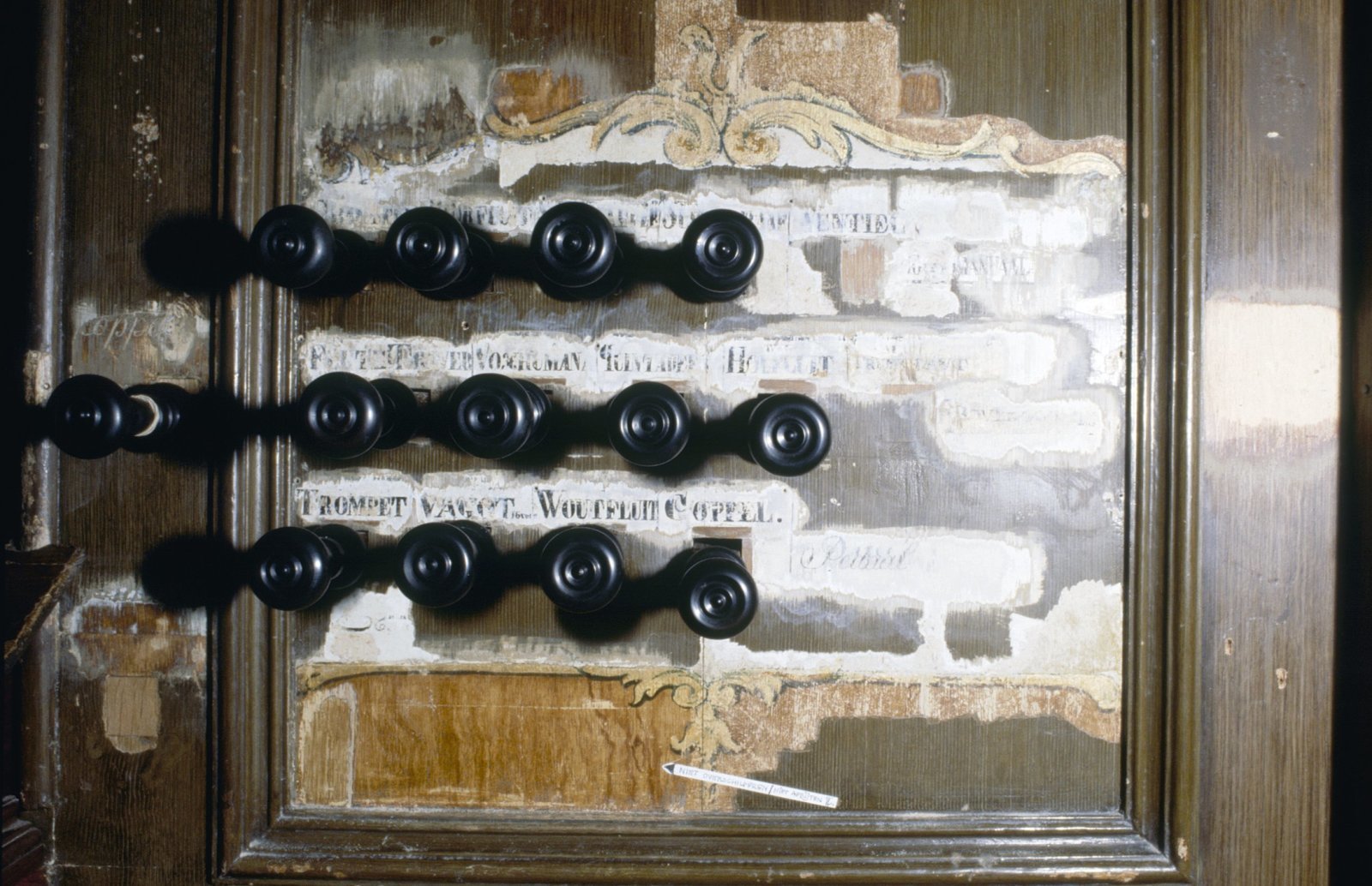 Interieur,orgel, klaviatuur, registerknoppen met naa...