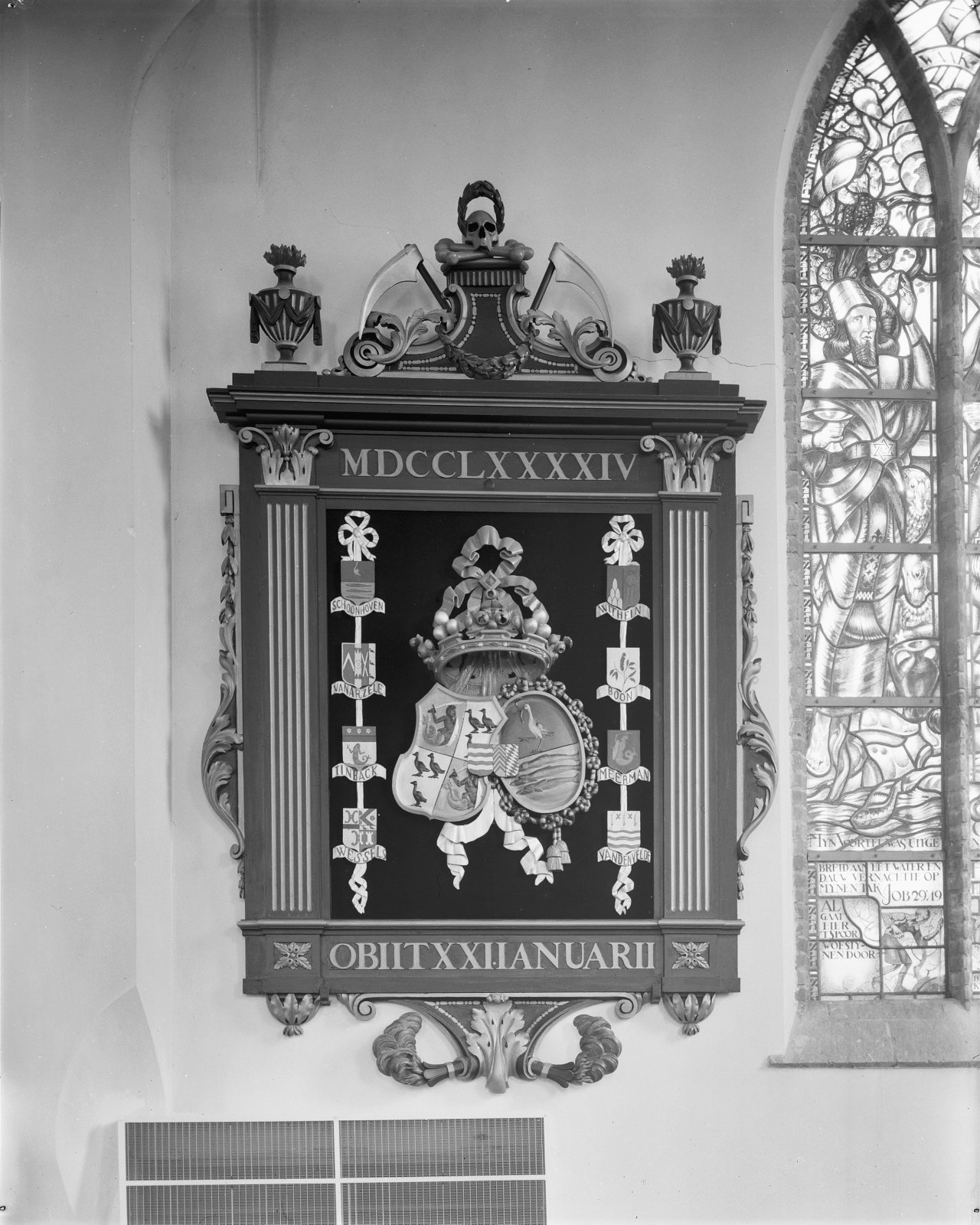 Interieur, gebrandschilderd glas, raam 19: "Wapen va...