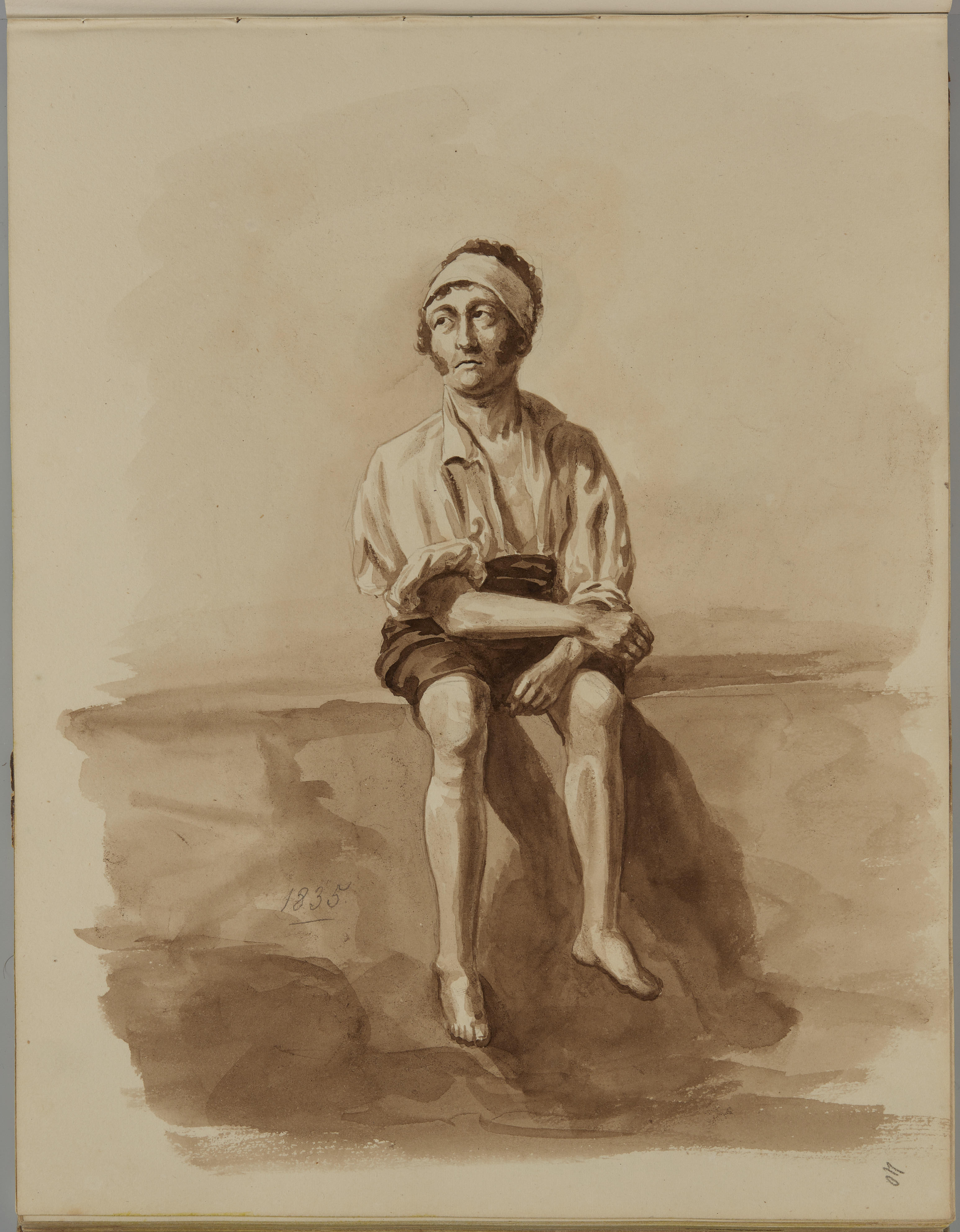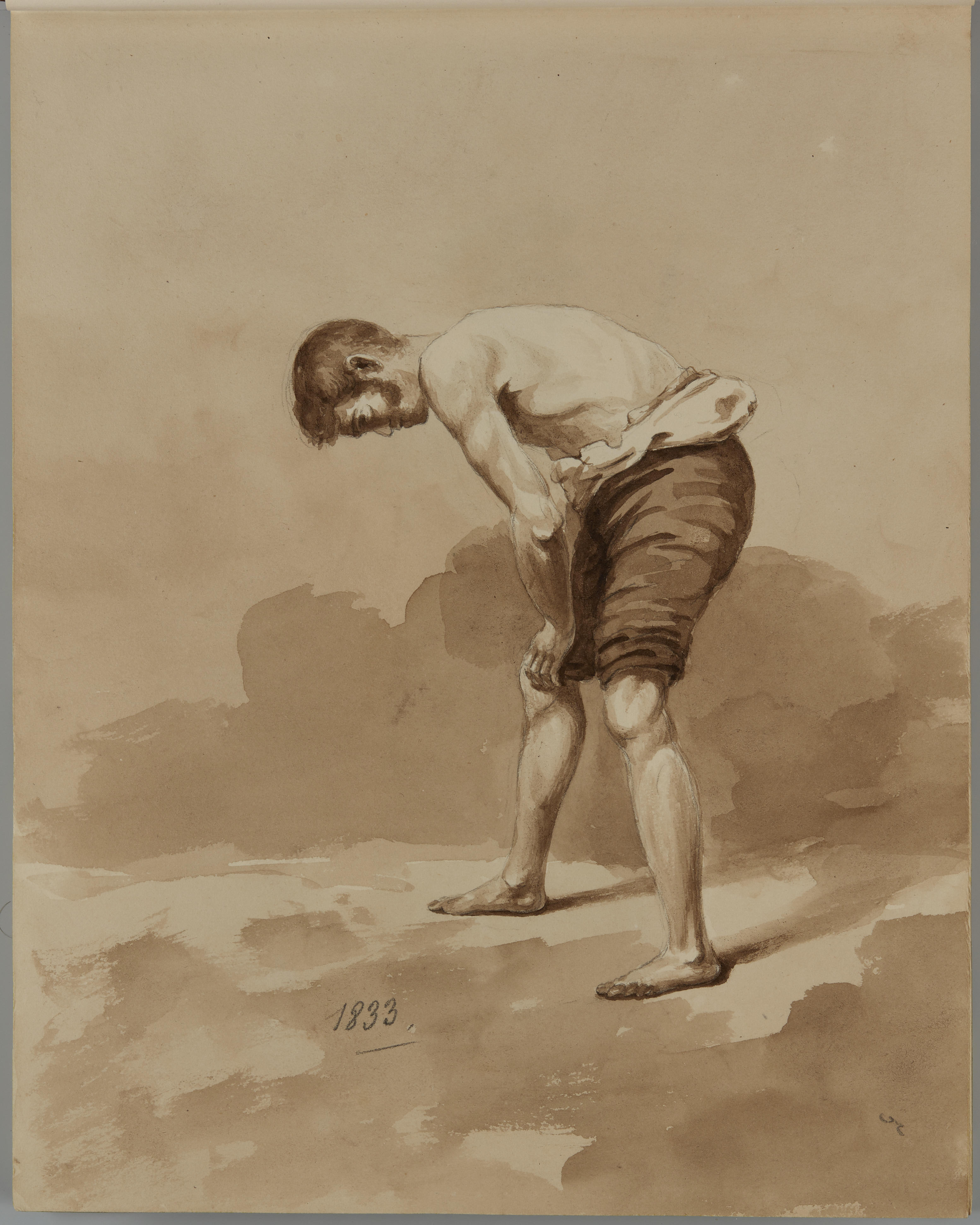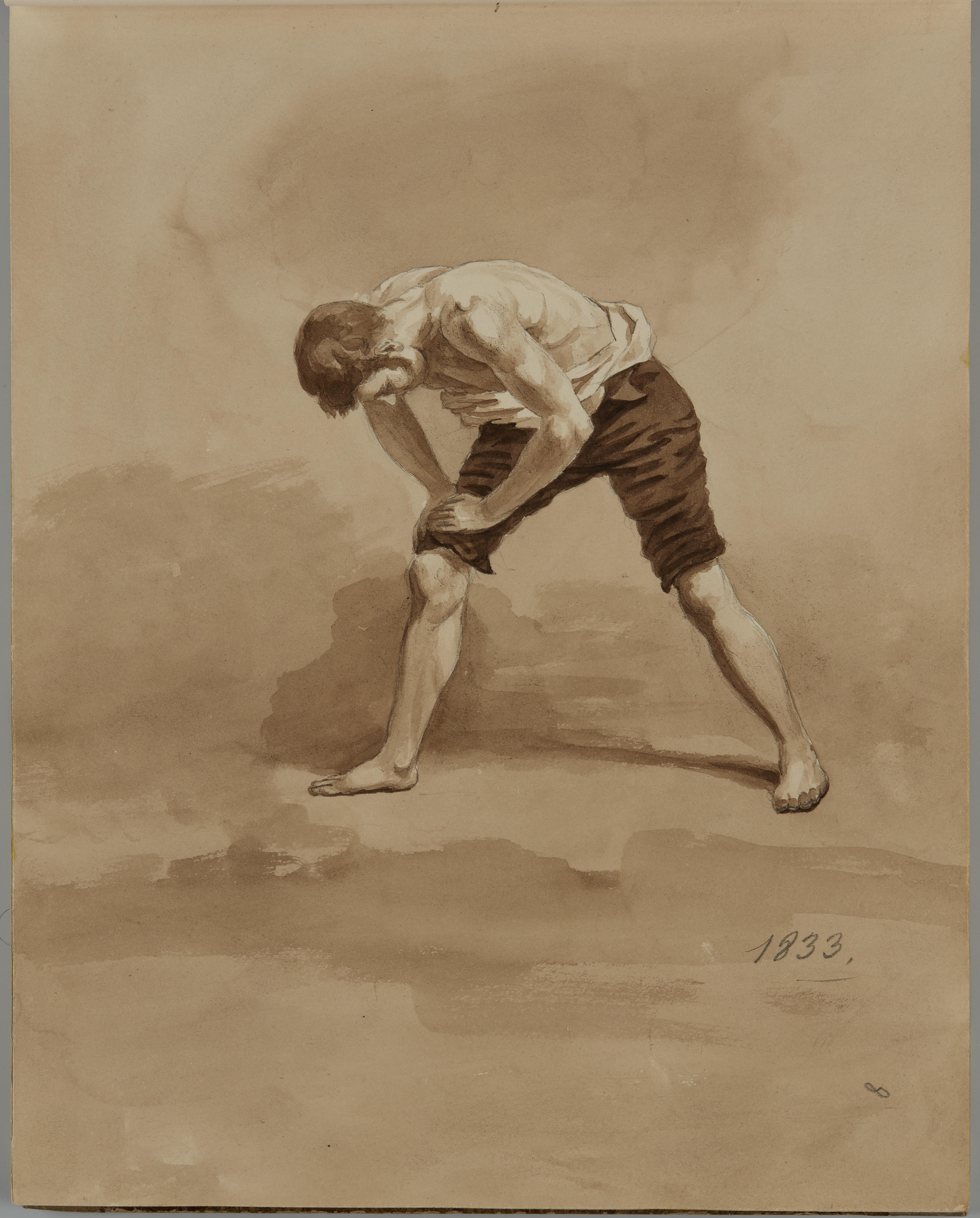 Tekening van een gebukte man met bloot bovenlijf, 1833