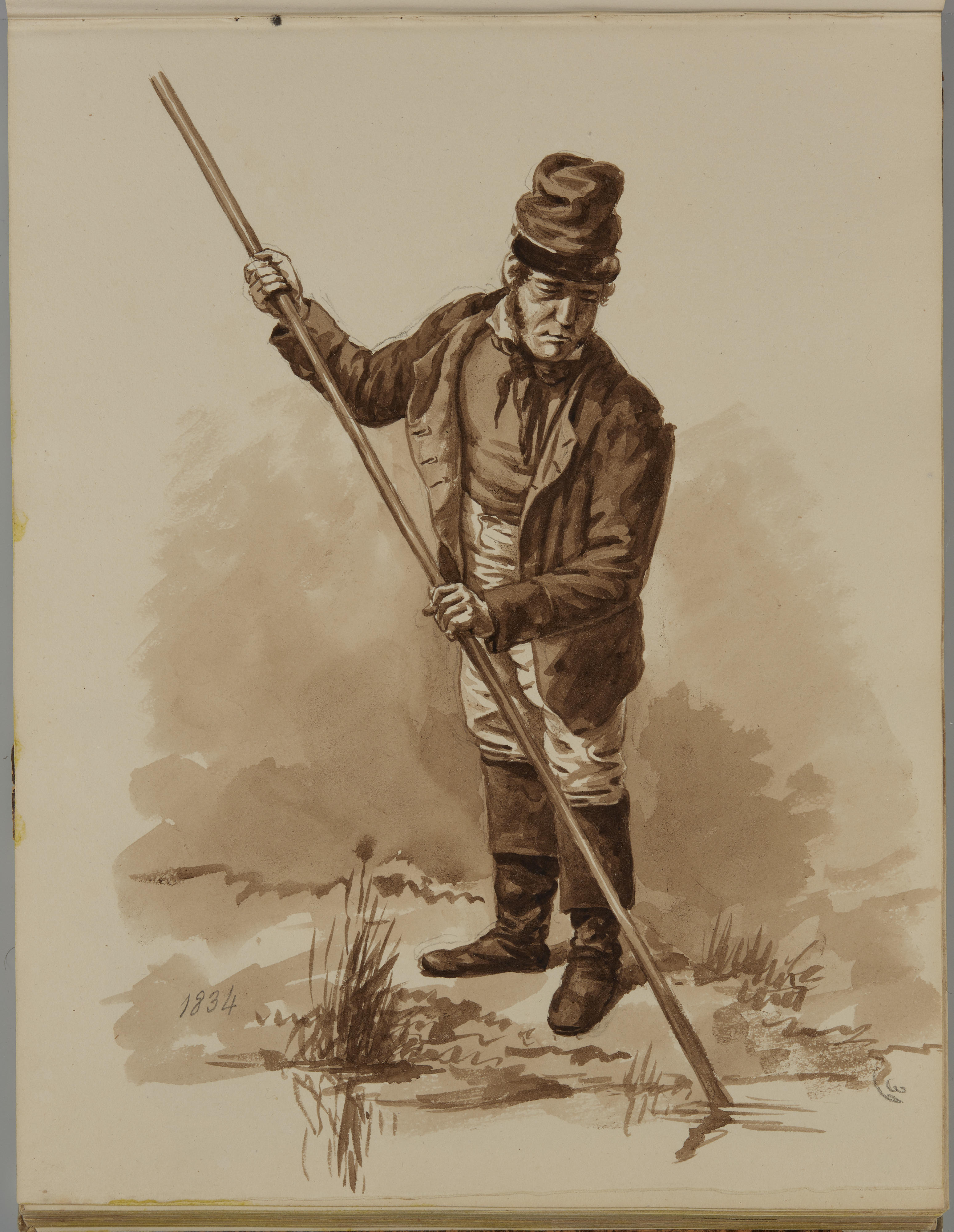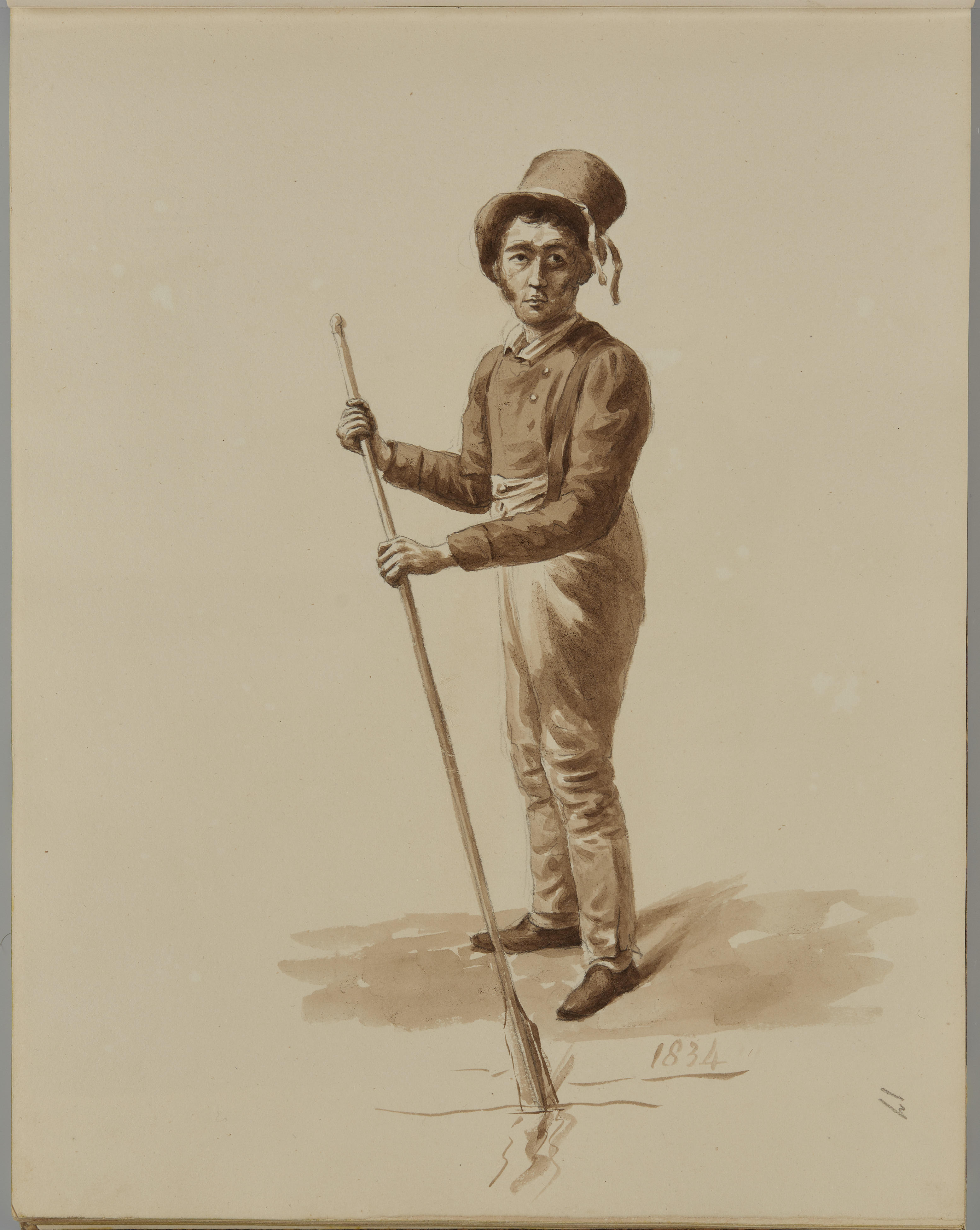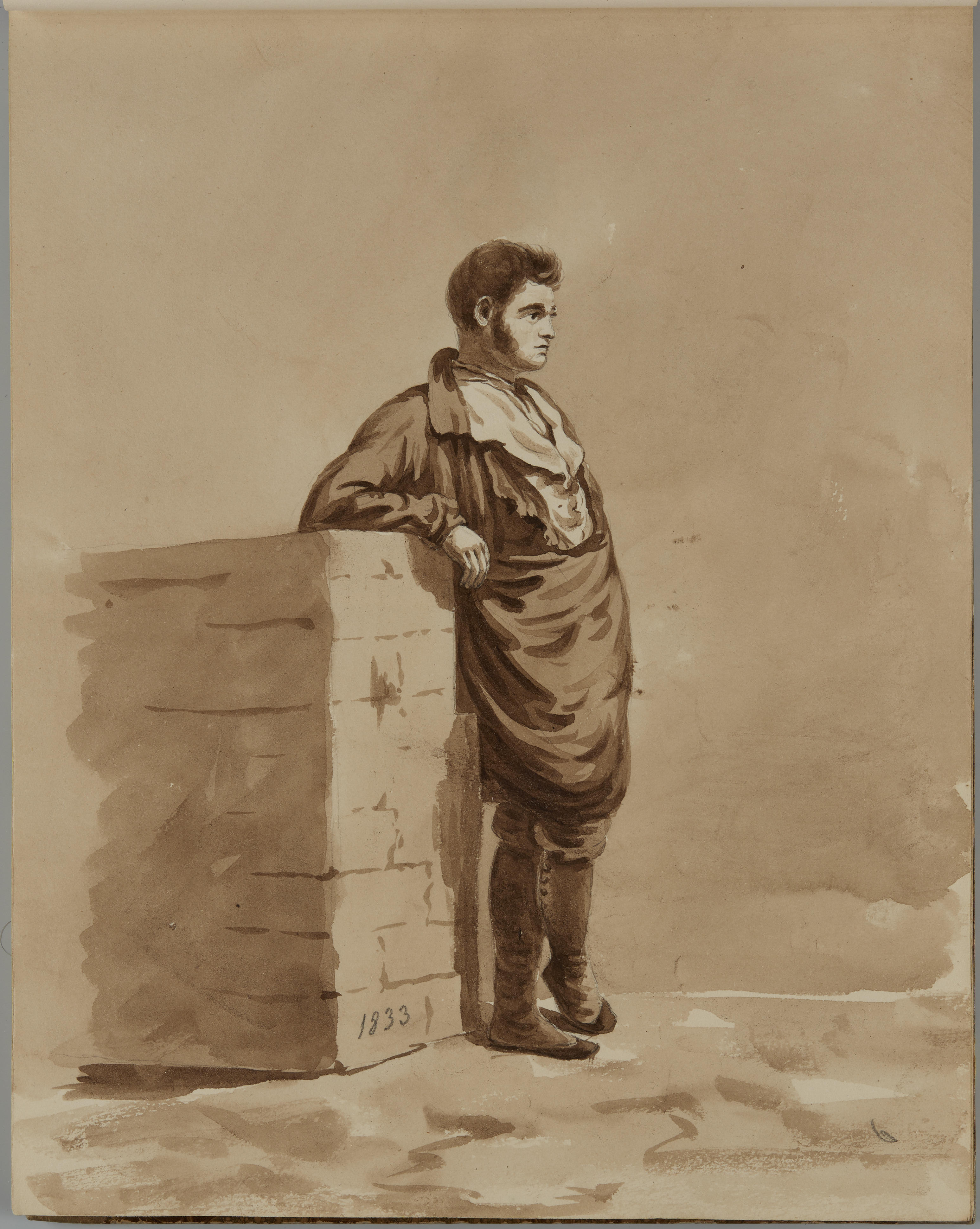 Tekening van een gebukte man met bloot bovenlijf, 1833