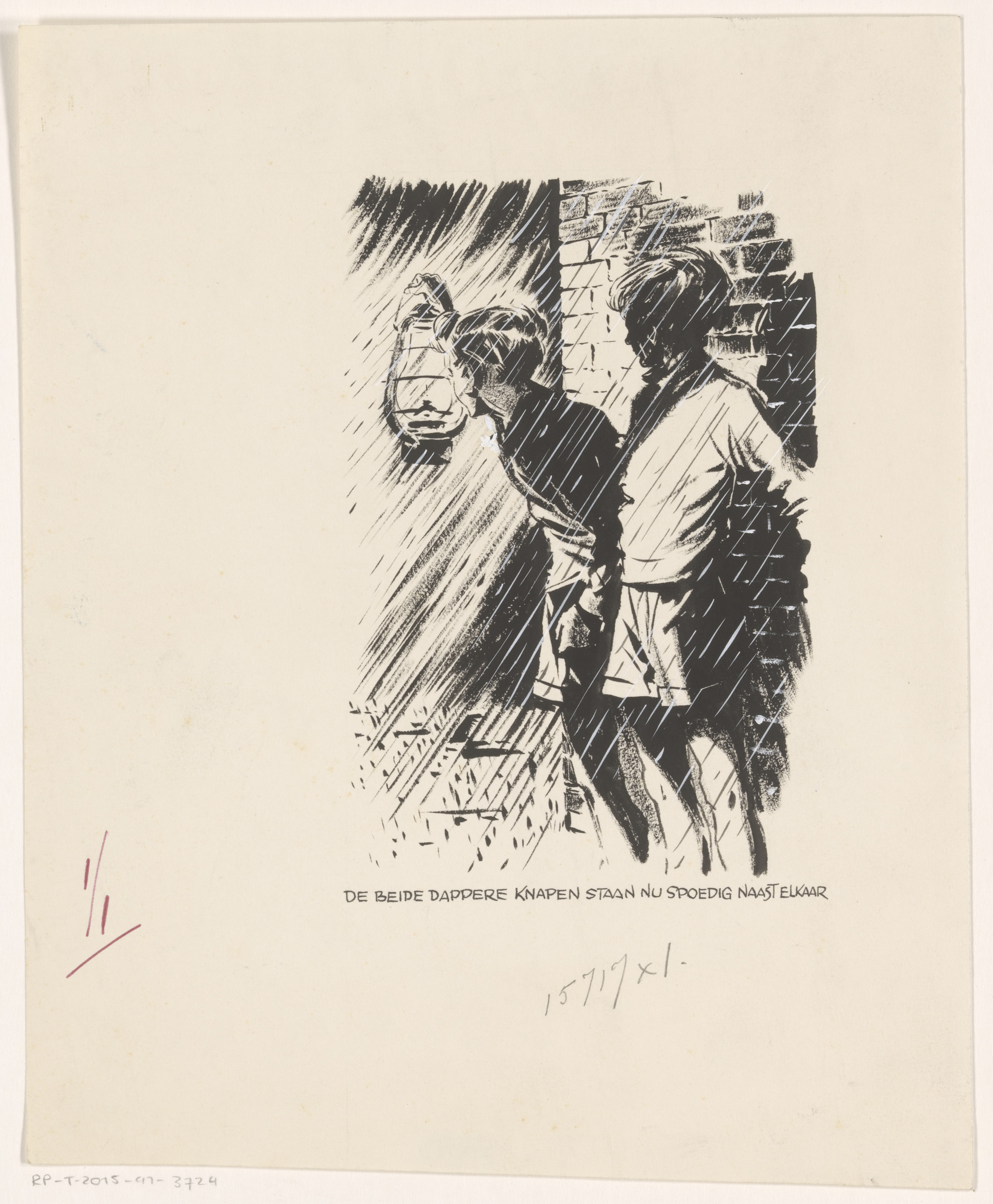 Twee jongens bij een muur in de regen