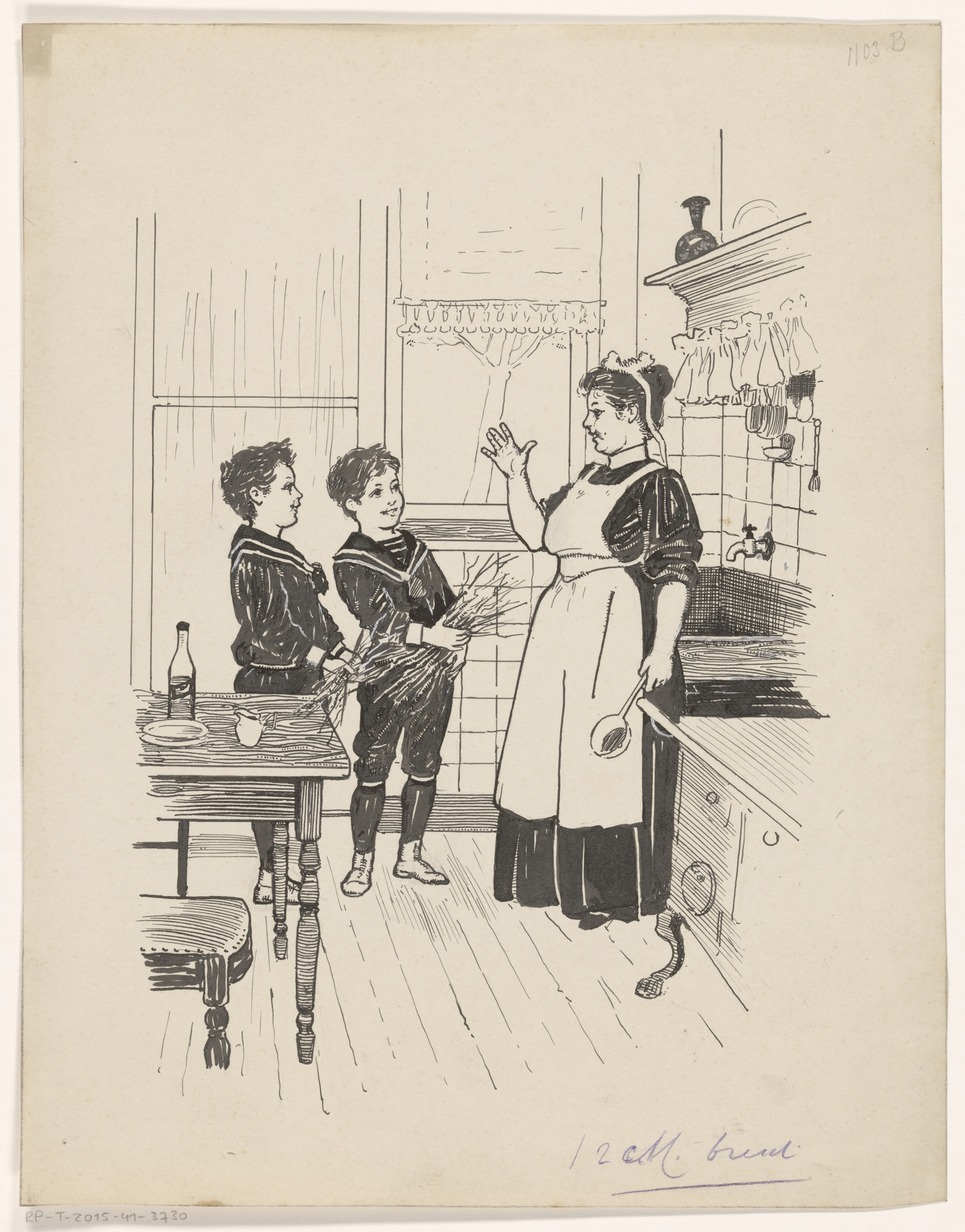 Jongens met takkenbossen in een keuken